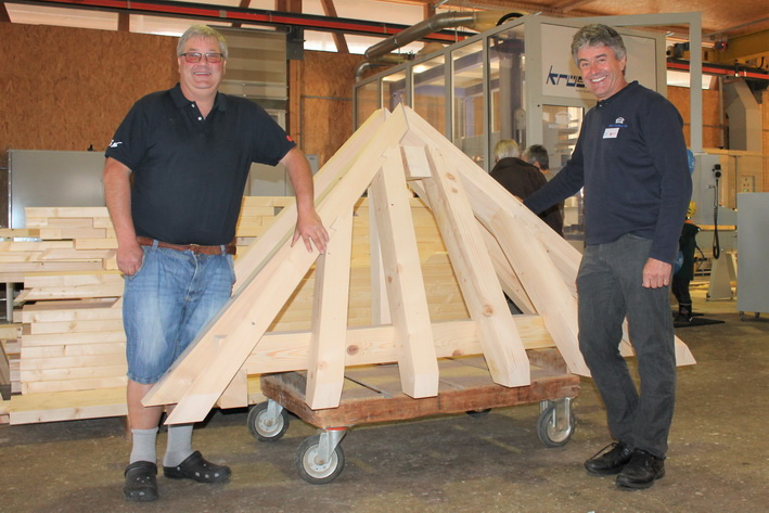 Mit dem «AbbundWerk Schachen» nutzen die Beer Holzbau AG und die Zimmerei Held wichtige Synergien im nachhaltigen Holzbau. Heinz Beer investierte mit dem «AbbundWerk Schachen» in die Zukunft. Die beiden Unternehmer Heinz Beer und Rolf Held, welche sich seit Jugendtagen kennen, arbeiten bei Projekten gerne zusammen und helfen sich aus, sollte Not am Mann sein. Am Tag der offenen Tür vom vergangenen Samstag boten die Beer Holzbau AG und die Zimmerei Held gemeinsam Einblick in die Welt des Holzhandwerks. Als besonderer Höhepunkt wurde die topmoderne CNC-Abbundanlage der Schweizer Firma Krüsi Maschinenbau AG, Schönengrund, präsentiert, mit der standardmässig 15 Meter lange Hölzer und sechs bis zehn Kubikmeter Holz pro Tag bearbeitet werden können.