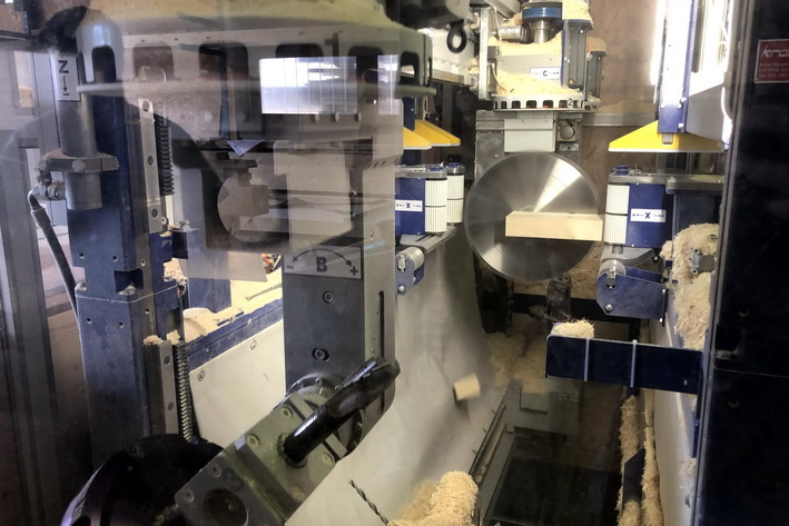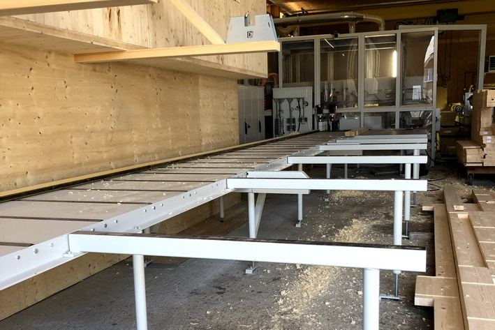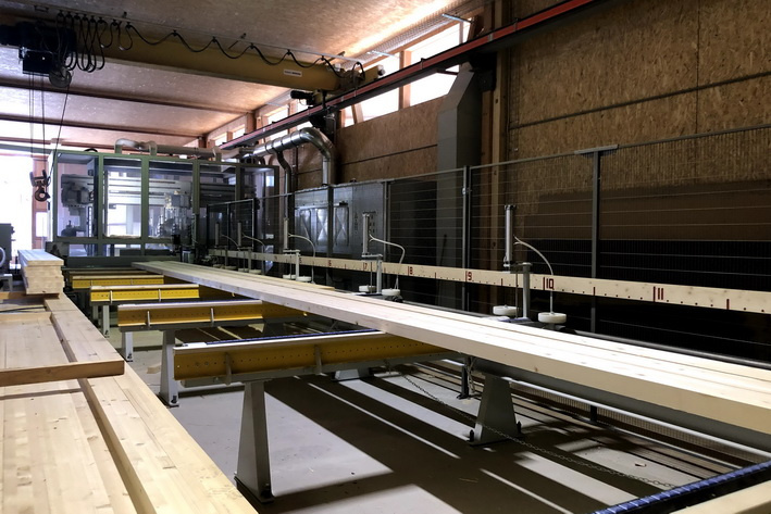 Die Daten der Projektleiter in Ostermundigen fliessen direkt an die CNC-Maschine im Schachen. Dort werden von der Krüsi die gewünschten Bauteile millimetergenau gefertigt. Vom einfachen Kappschnitt bis zu komplexen Konturen, ist fast alles möglich. Die Anlage ist mit total 5 Aggregaten und 13 fixen Werkzeugen ausgestattet. Das ermöglicht Werkstücke mit einem Querschnitt von 650 x 300 mm mit beliebigen Längen, allseitig, leistungsstark und präzise zu bearbeiten.