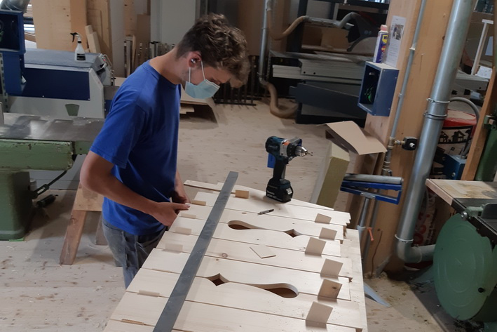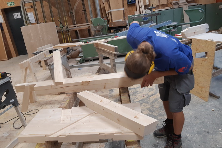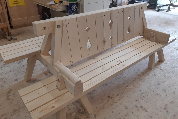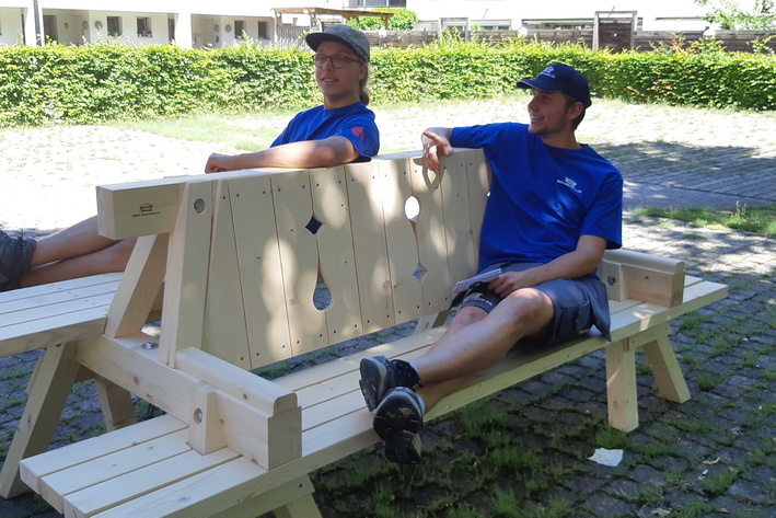 Aus einem internen Wettbewerb unter den Lernenden wurden die besten Ideen gewählt und zu einer Einheit zusammengefügt. Nico Redling und Lukas Vollmer, beide im 3. Lehrjahr, haben dann die Umsetzung und Ausführung mit viel Engagement und Herzblut übernommen. Entstanden ist eine vielseitige beidseitig sitzbare Bank, vollständig aus Schweiz Holz. Das Bänkli vereint generationenübergreifenden Holzbau: digitale Baukultur basierend auf Tradition, Handwerk und Technik.