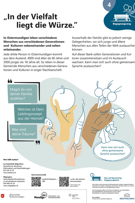 Die Gemeinde Ostermundigen hat das Projekt Begegnungsweg ins Leben gerufen. Die Ursprungsidee entstand, um der Einsamkeit während der Corona-Pandemie entgegenzuwirken. Jeden Mittwochnachmittag bei schönem Wetter bot das «Zuhörbänkli» Gehör für alle Interessierten. Dieses Zuhörbänkli brachte dann die Idee des Begegnungswegs ins Rollen. In Ostermundigen verteilt sollen Sitzbänke stehen mit Themen, welche Studierende nach einer Befragung der Einwohner Ostermundigens zusammengestellt haben.