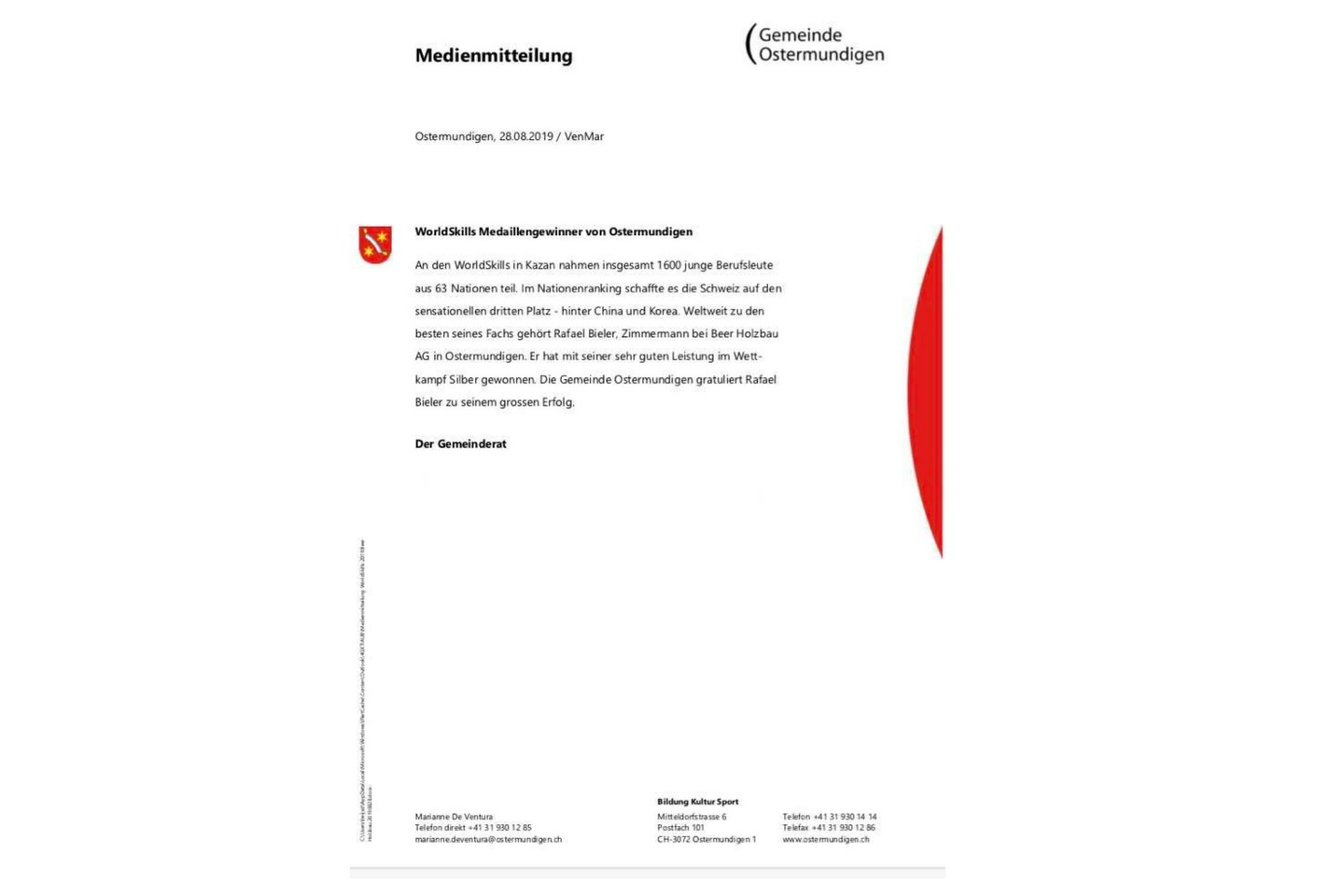 Nach vier Wettkampftagen holte sich unser Rafael Bieler an den WorldSkills 2019 in Russland den Vizeweltmeistertitel als Zimmermann. Beer Holzbau gratuliert ihm herzlich zu dieser hervorragenden Leistung. Rafi – wir sind sehr stolz auf dich!
