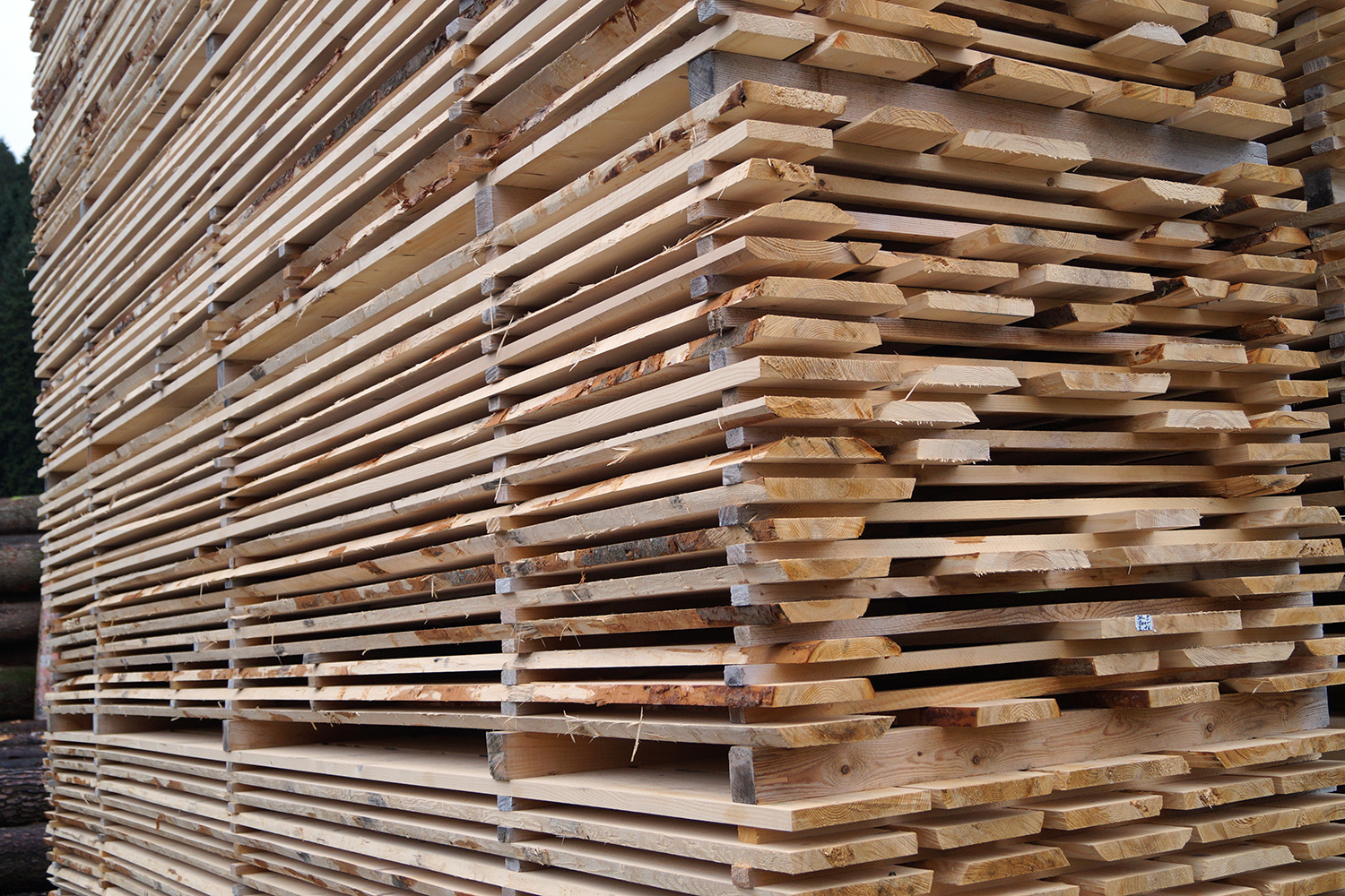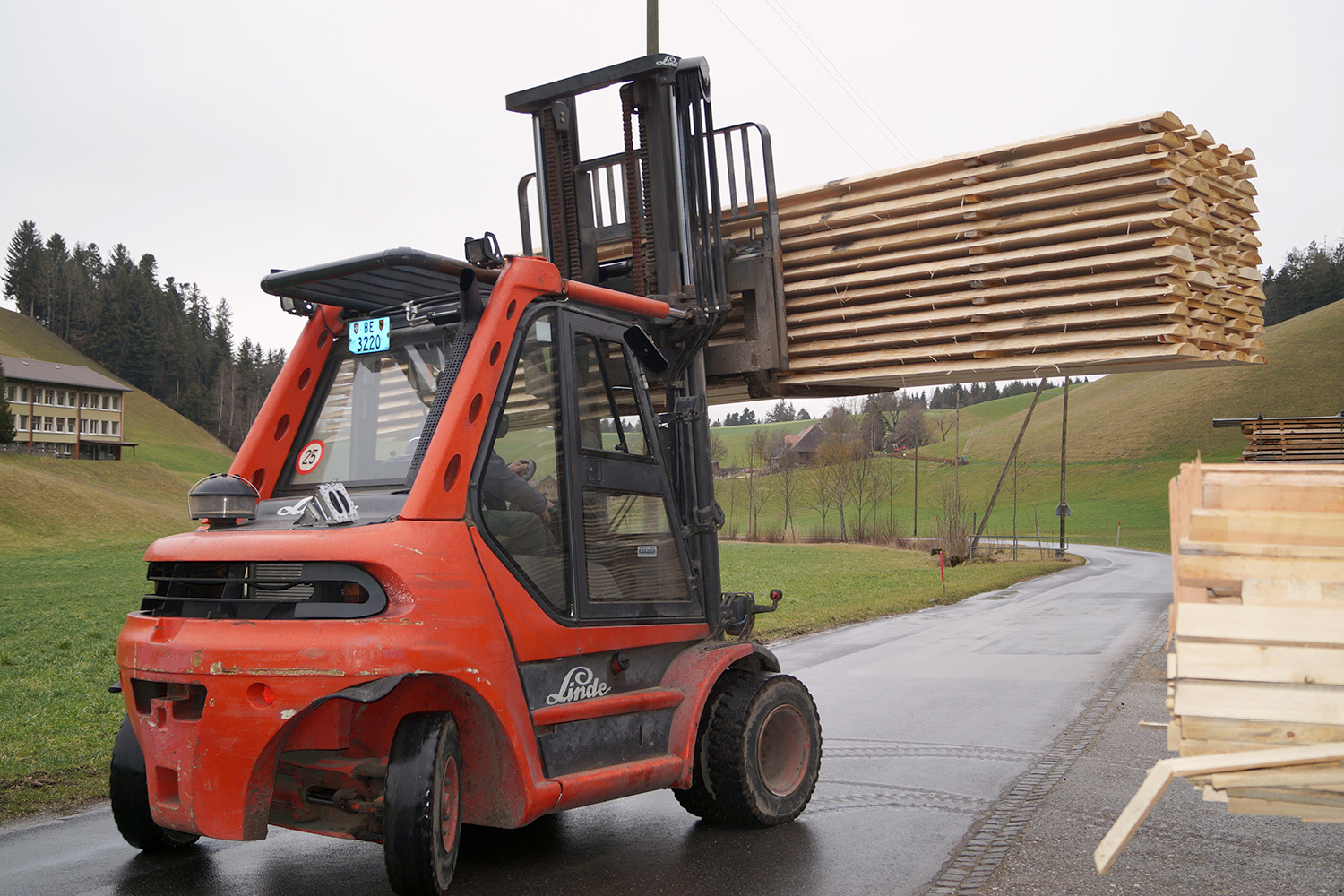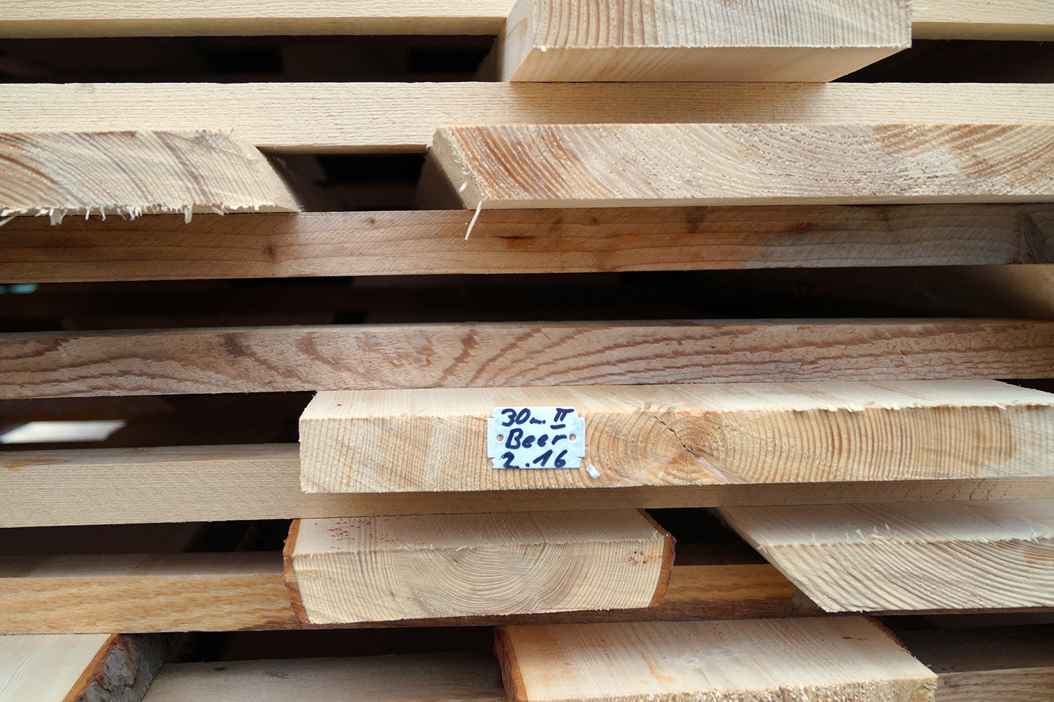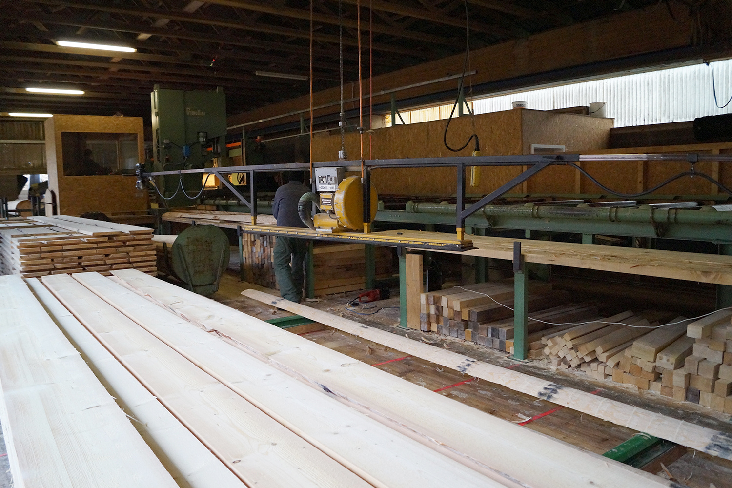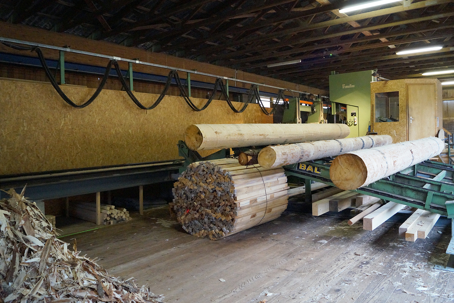 Gleichzeitig wurde das im Dezember geschlagene Holz aus unseren Emmentaler Wäldern in der Sägerei Küpfer, Schwanden i.E., eingeschnitten und zum Trocknen gestapelt.