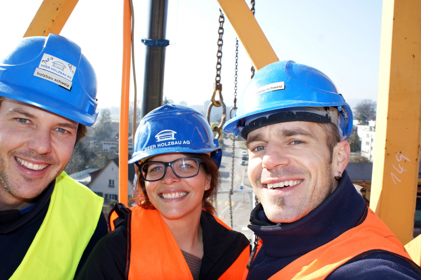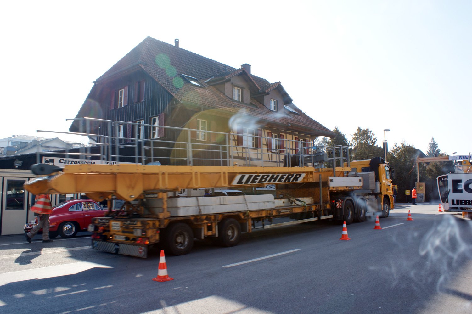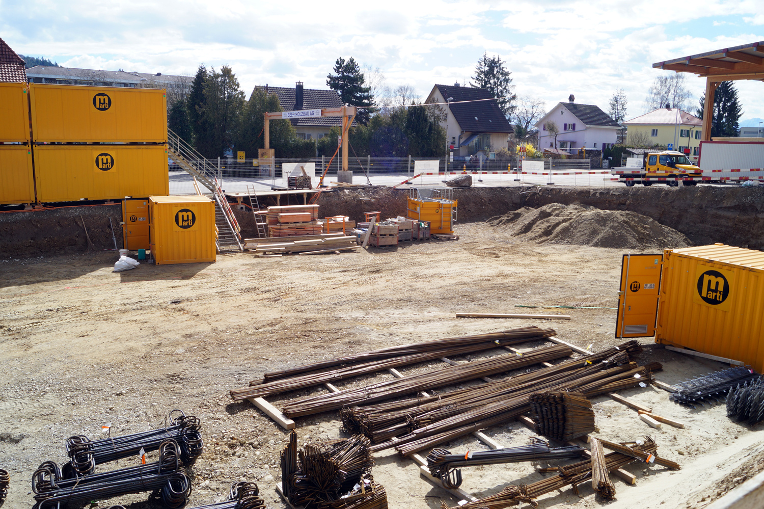 Der grosse Baukran erhielt ein eigenes und solides Betonfundament. Der 29.5m hohe Baukran mit seinem 50m langen "Ausleger" wurde am 17.03.2016 aufgestellt und in Betrieb genommen. Gleichzeitig konnte auch die Infrastruktur der Firma Marti auf dem Bauplatz beginnen.
