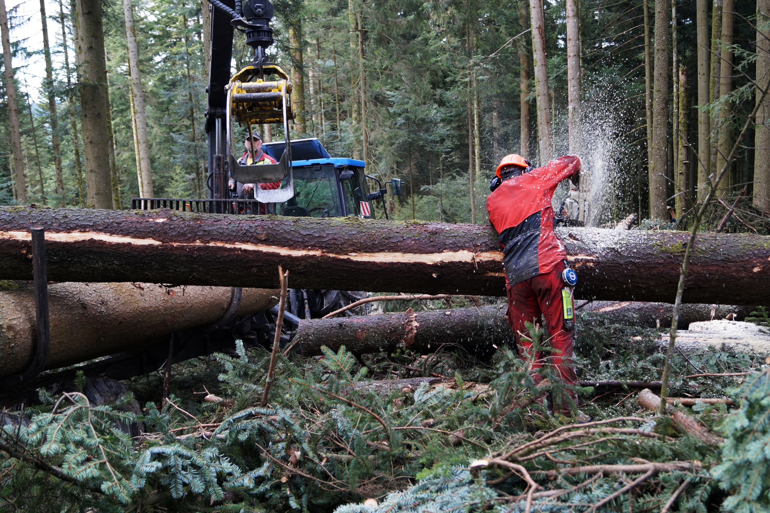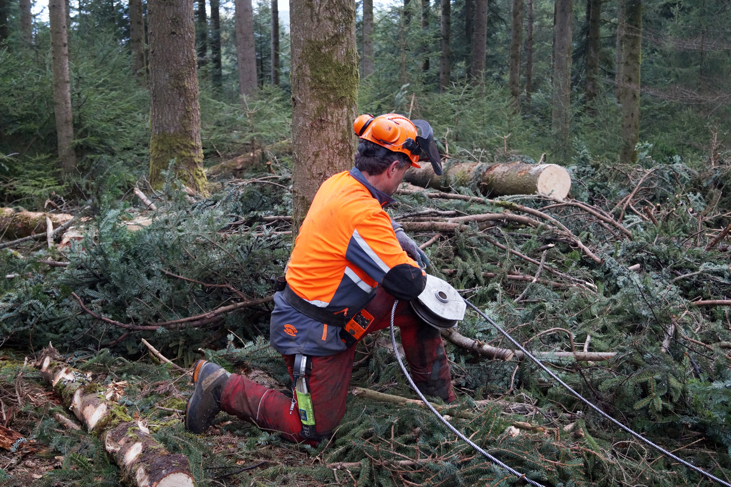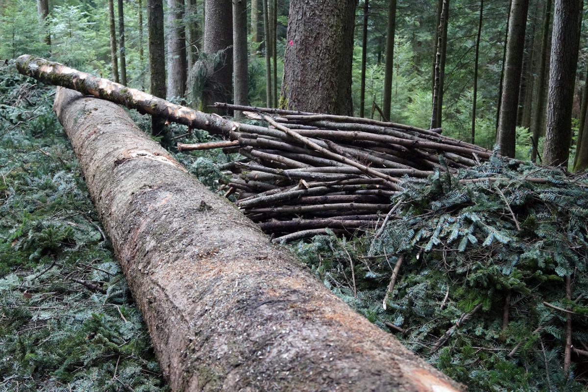 Über die Ostertage sind in Schlosswil die Bäume vom Mondholzschlag entastet worden und anschliessend auf die Länge zugeschnitten. Mit Traktor und Holzanhängern wurden sie danach zum Waldrand transportiert und auf einem grossen "Trämelhaufen" aufgeschichtet.