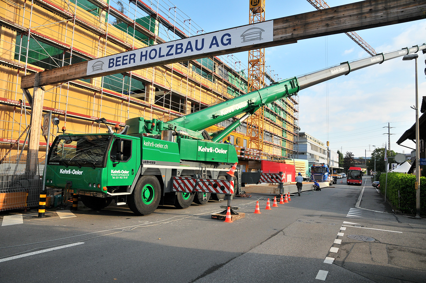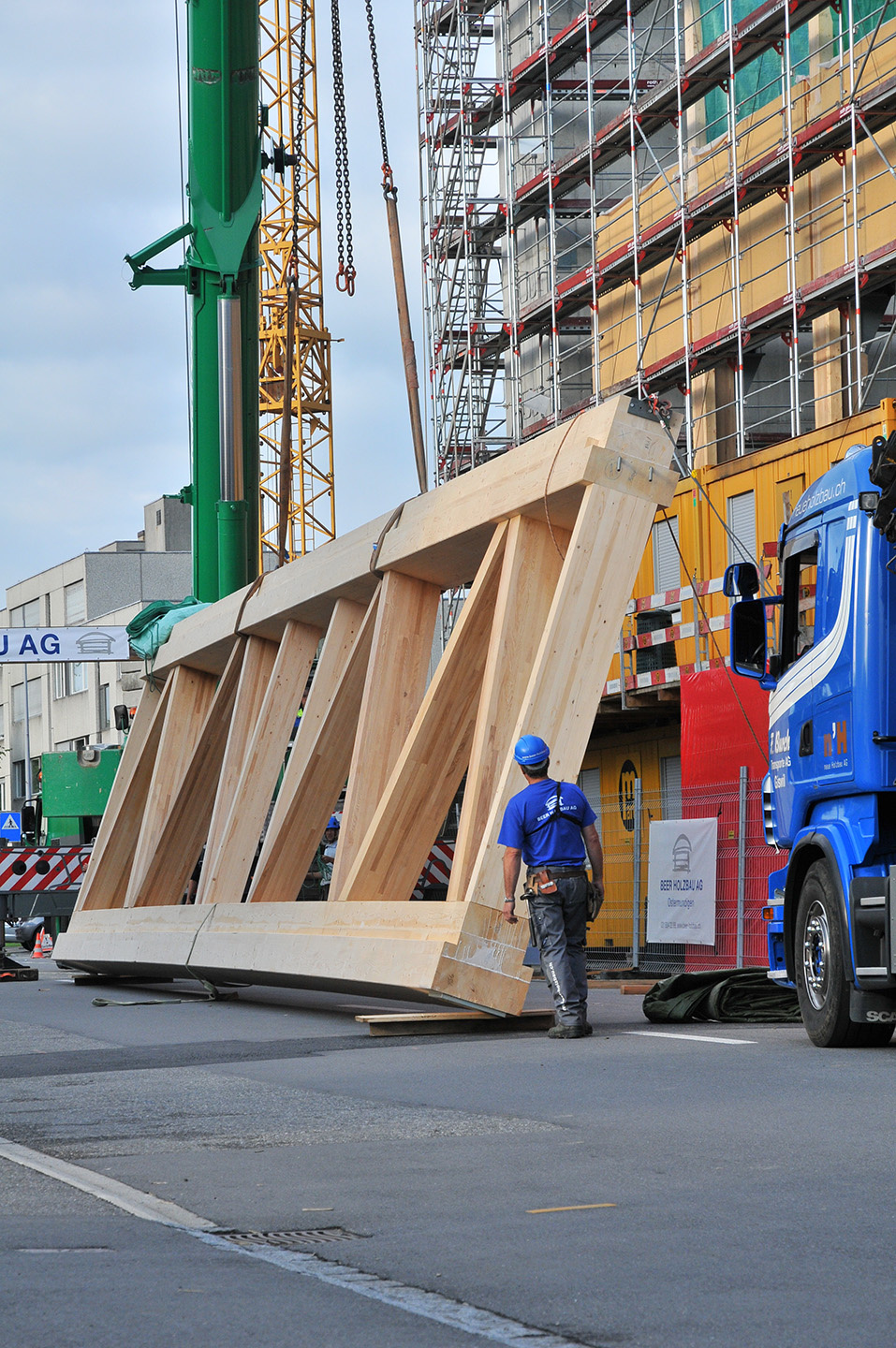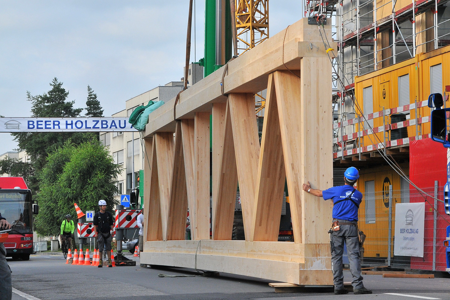 Die letzten Träger und Elemente werden angeliefert, mit Hilfe des Krans platziert und millimetergenau montiert.