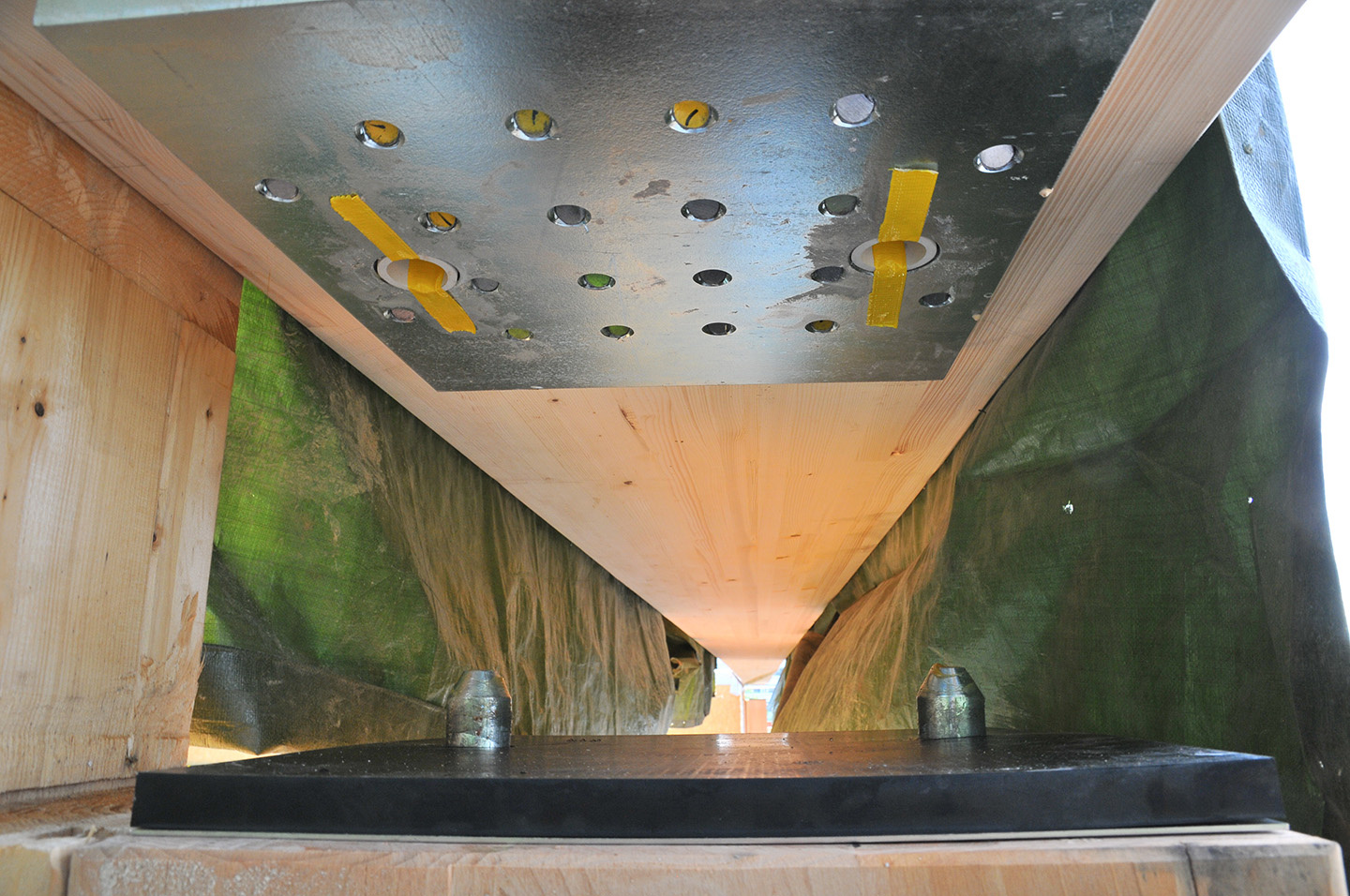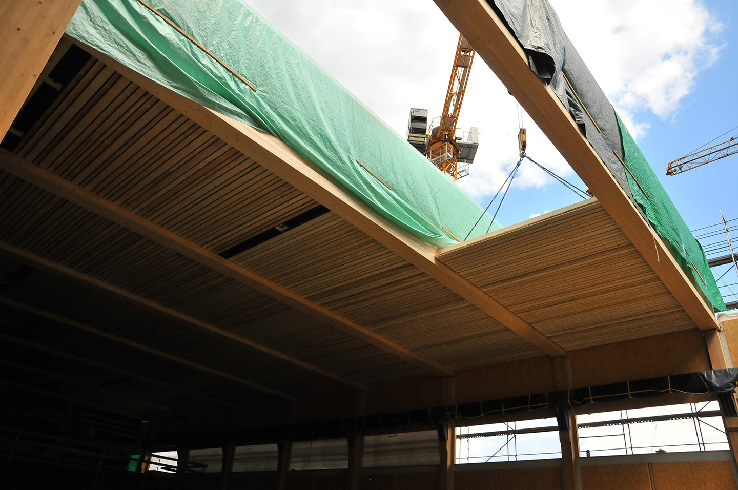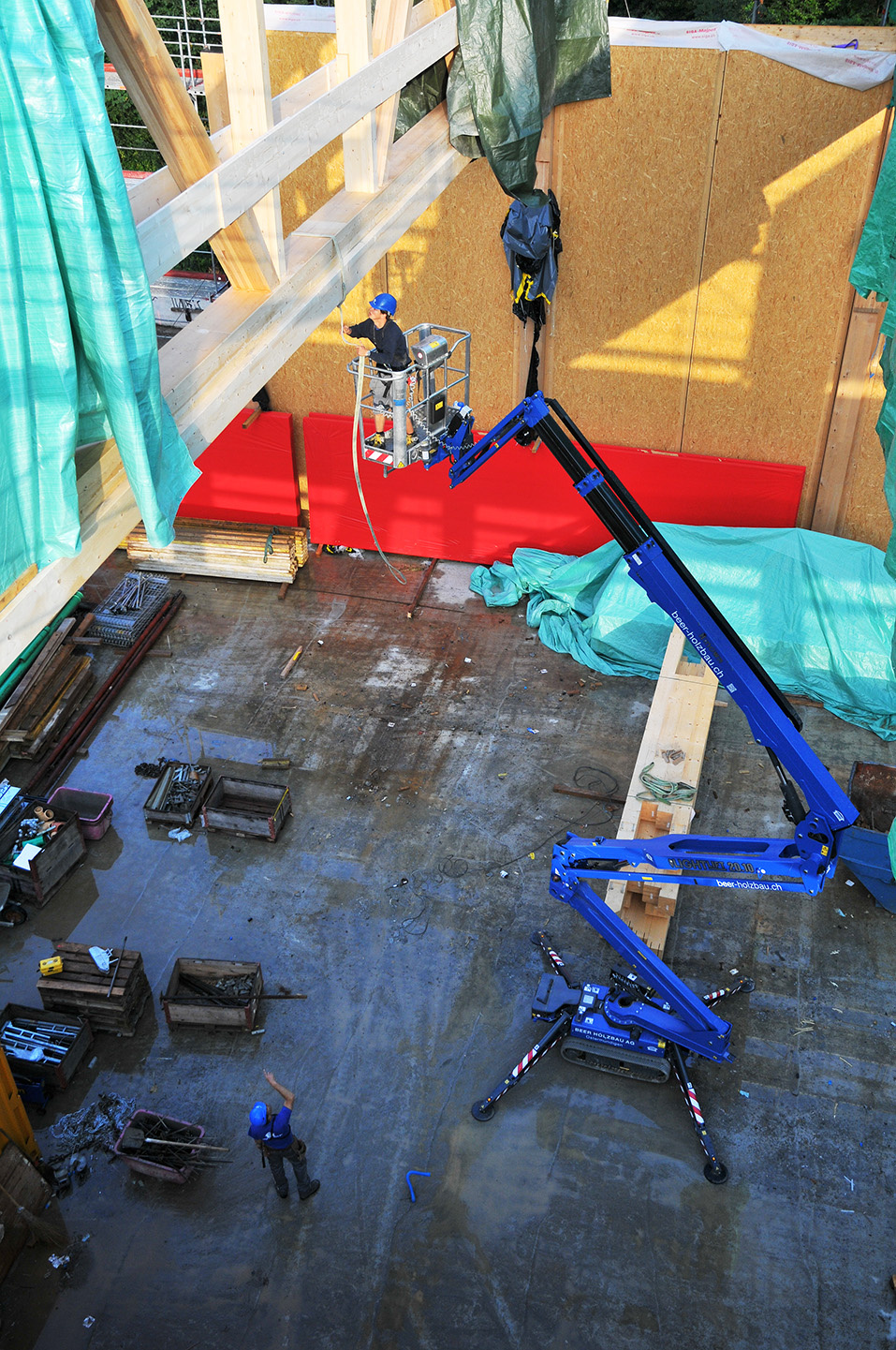 Die letzten Träger und Elemente werden angeliefert, mit Hilfe des Krans platziert und millimetergenau montiert.