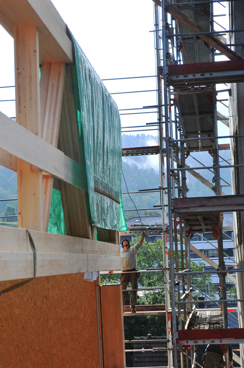 Alle Stockwerke sind aufgerichtet und im Dachgeschoss wurde bereits mit der Abdichtung des Flachdachs begonnen.