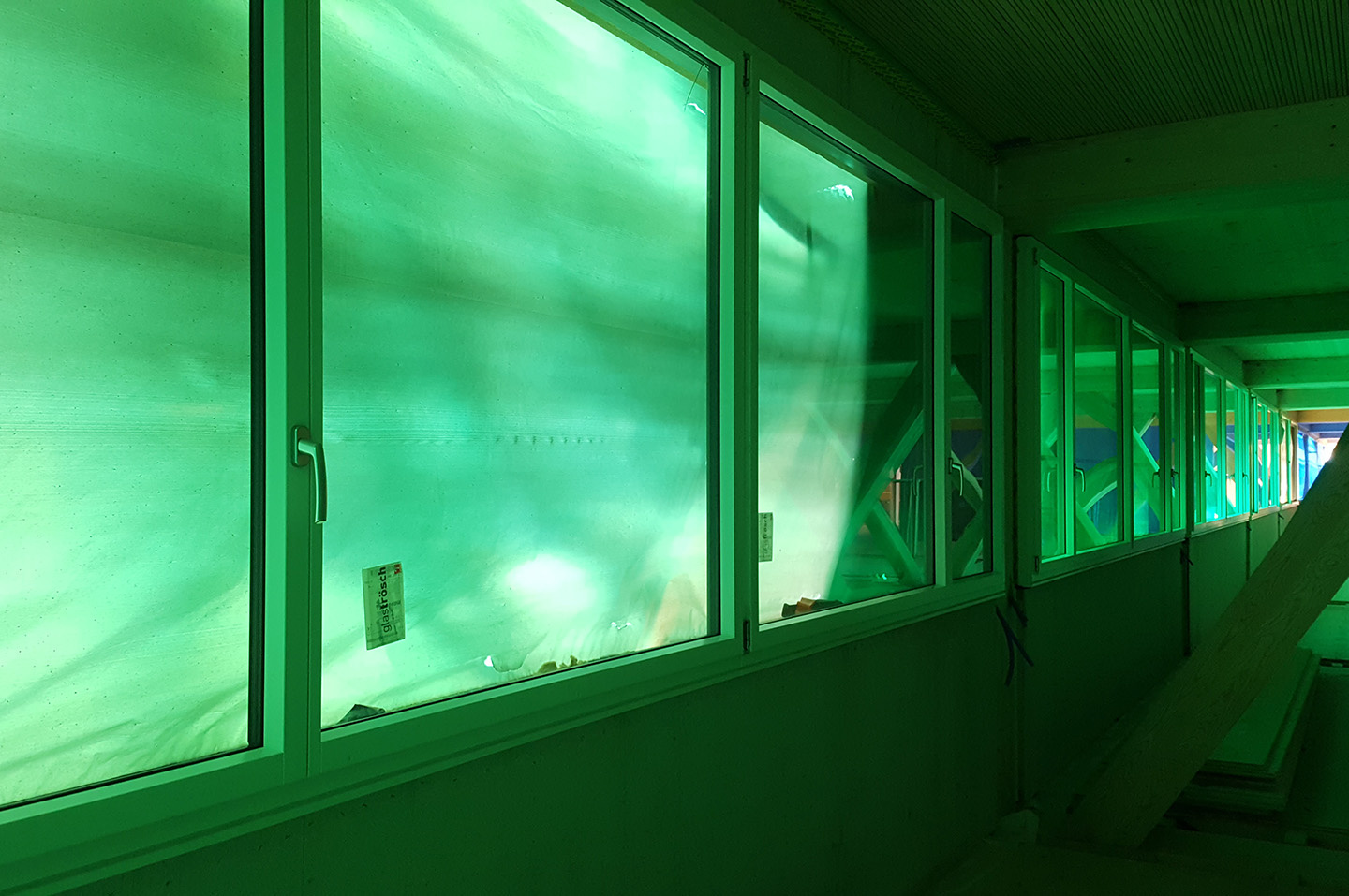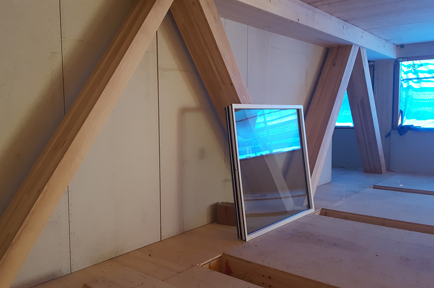Gleichzeitig werden die ersten Holzfenster montiert, welche die Räume mit Licht und Wärme versorgen werden.