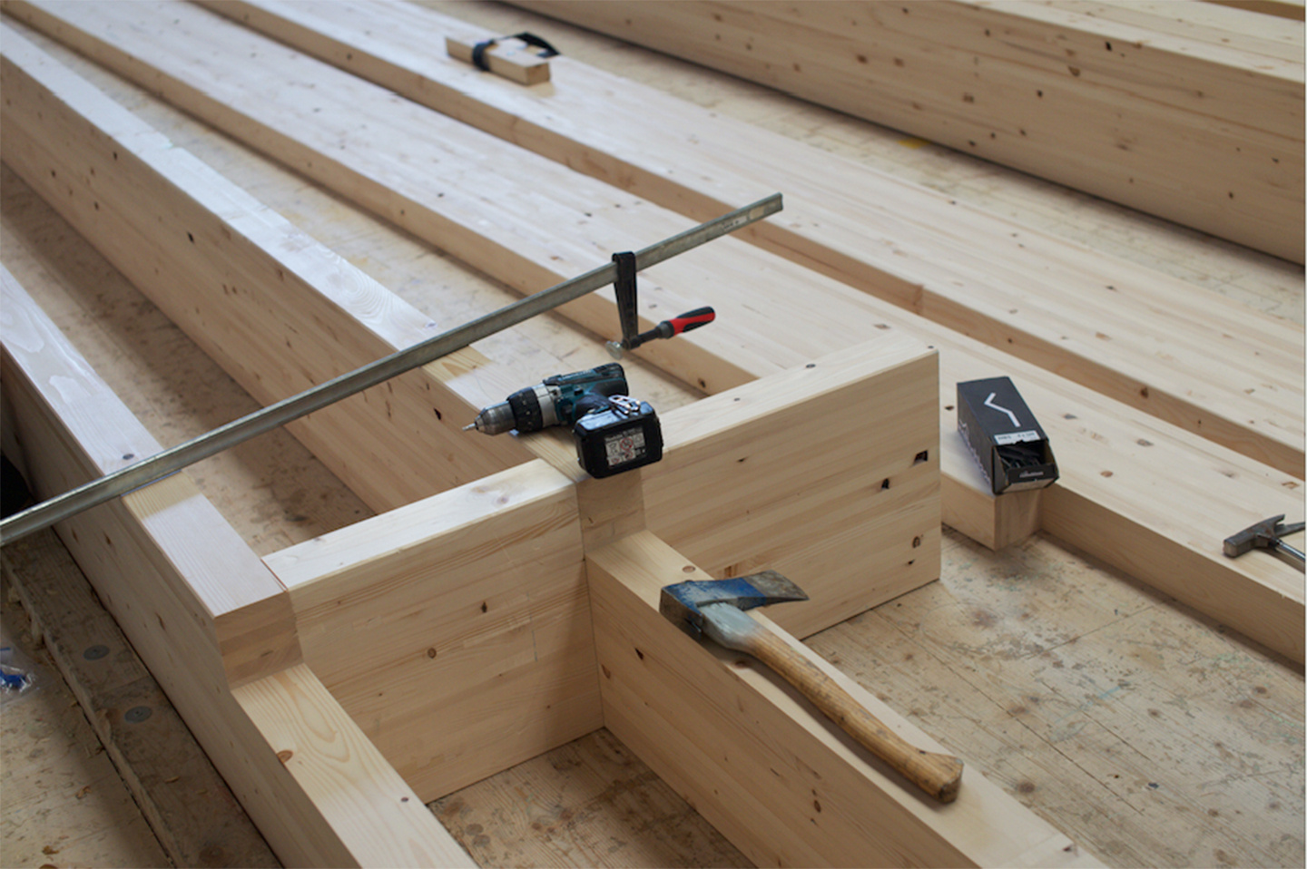 Die Arbeiten für Heizung, Lüftung, Klima und Sanitär sind in vollem Gange. Im gesamten Fachwerk wird ein komplexes Netz an Leitungen verbaut.