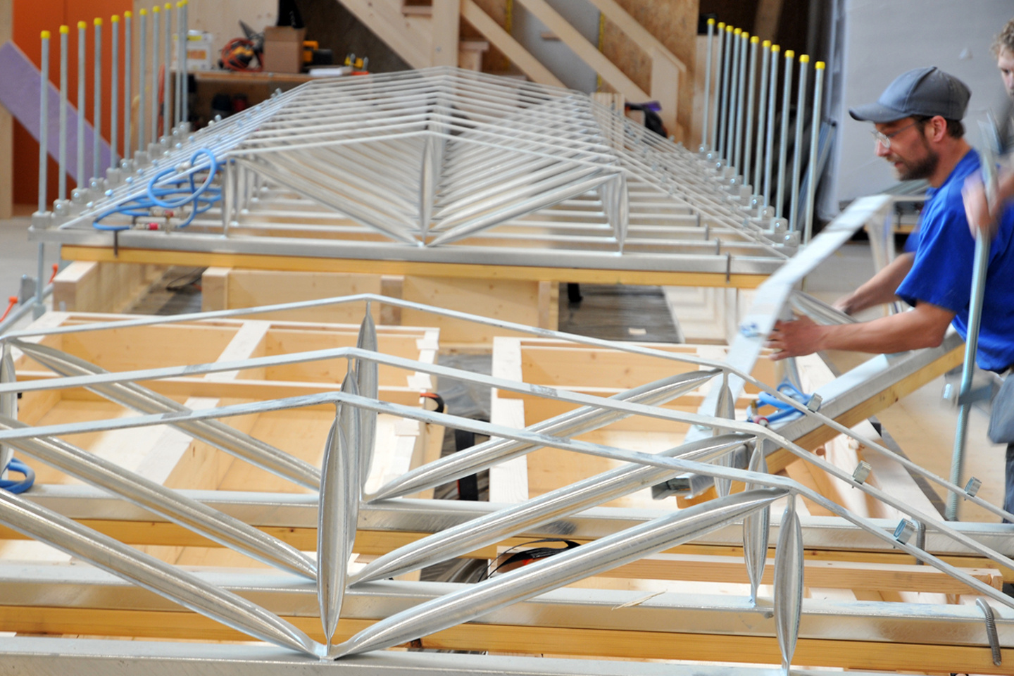 Die Photovoltaik-Anlage wurde angeschlossen und ist am Netz. Die Gerüste an der Nordseite des Gebäudes konnten demontiert werden. In den Attika-Wohnungen wurde mit der Beplankung der innenwände begonnen. In zwei Wohnungen ist der Unterlagsboden fertiggestellt worden. Die Fassade mit der besonderen Schwartenschalung wurde auf der Nordseite der Halle abgeschlossen.