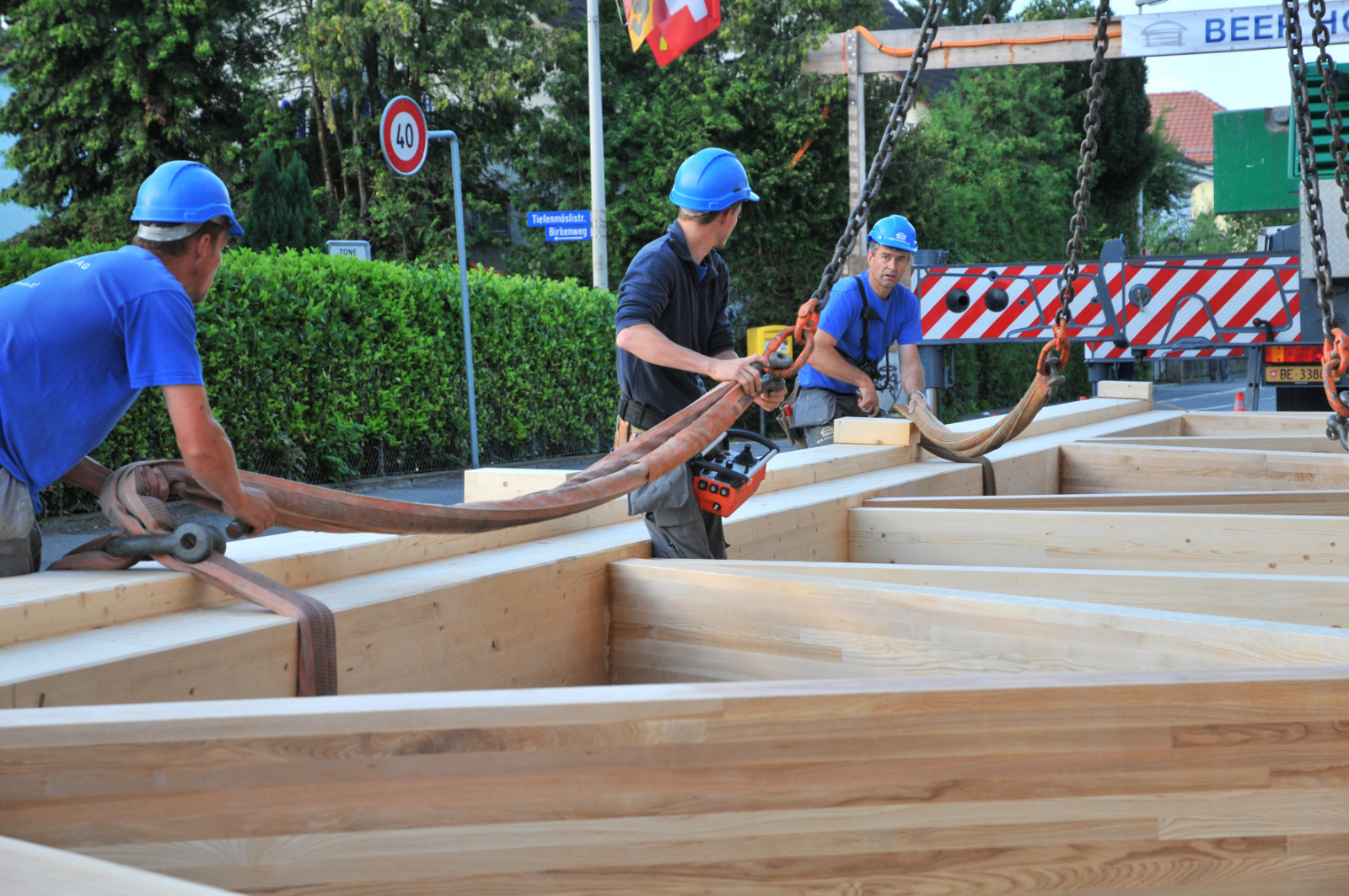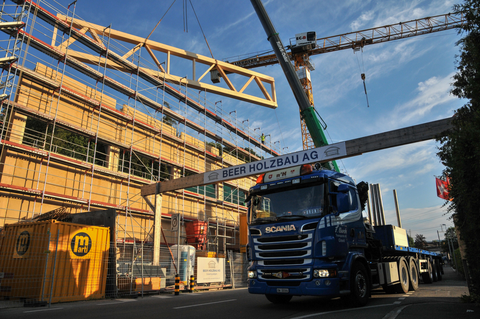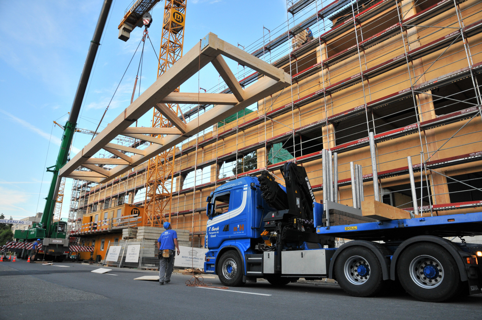 Für den Erneuerungsbau «FachWerk» der Beer Holzbau AG wurden 10 Binder à je 23 Meter länge und mit einem Gewicht von je 10 Tonnen in Ostermundigen angeliefert. Die Binder wurden mithilfe eines 130-Tonnen-Krans vom Schwertransporter entladen und in 10 Metern Höhe montiert.