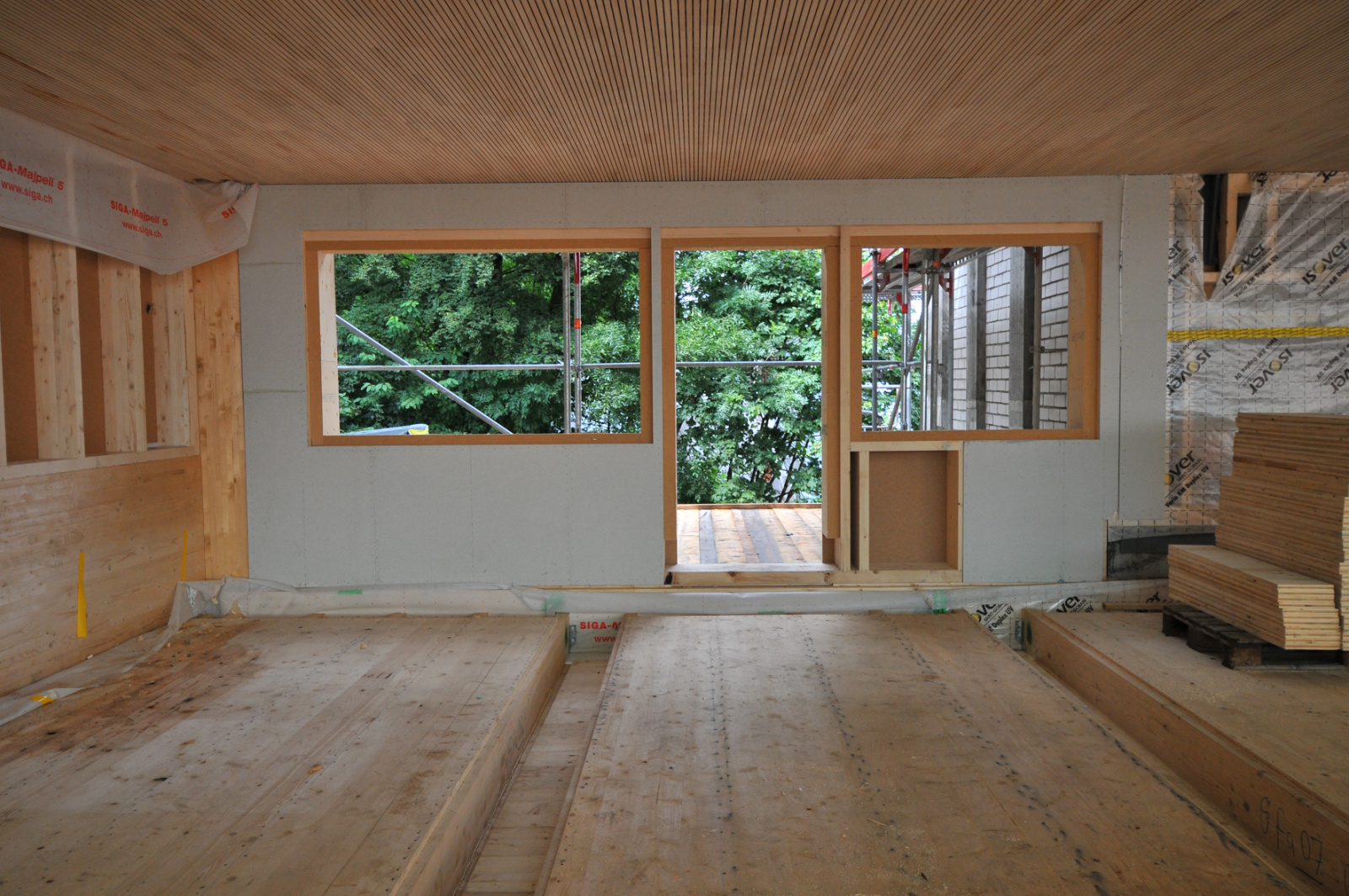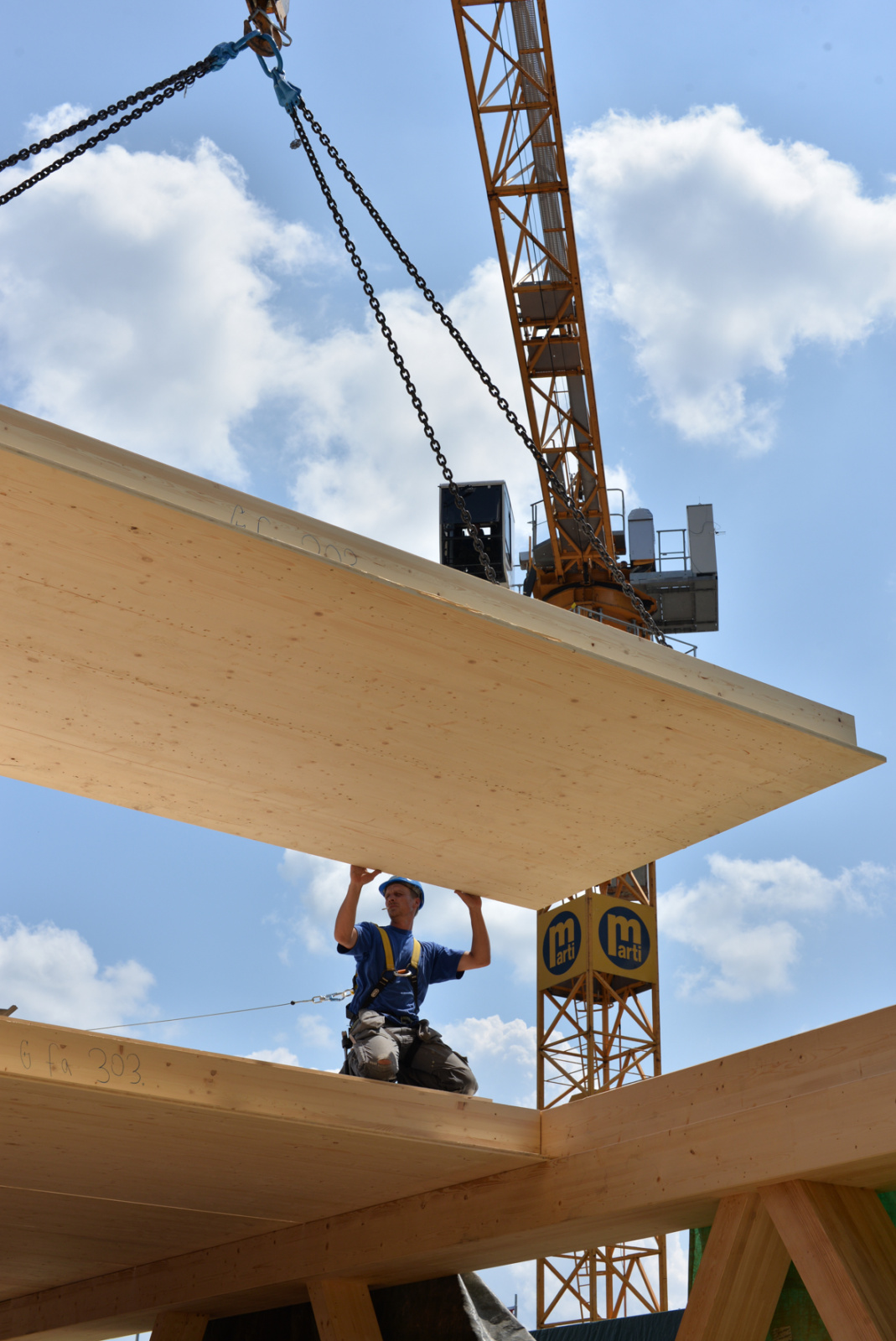 Jetzt sind die Zimmerleute definitiv auf die Baustelle gezogen. Gestartet wurde mit der Montage der insgesamt 213 Wandelemente im Maschinenraum.