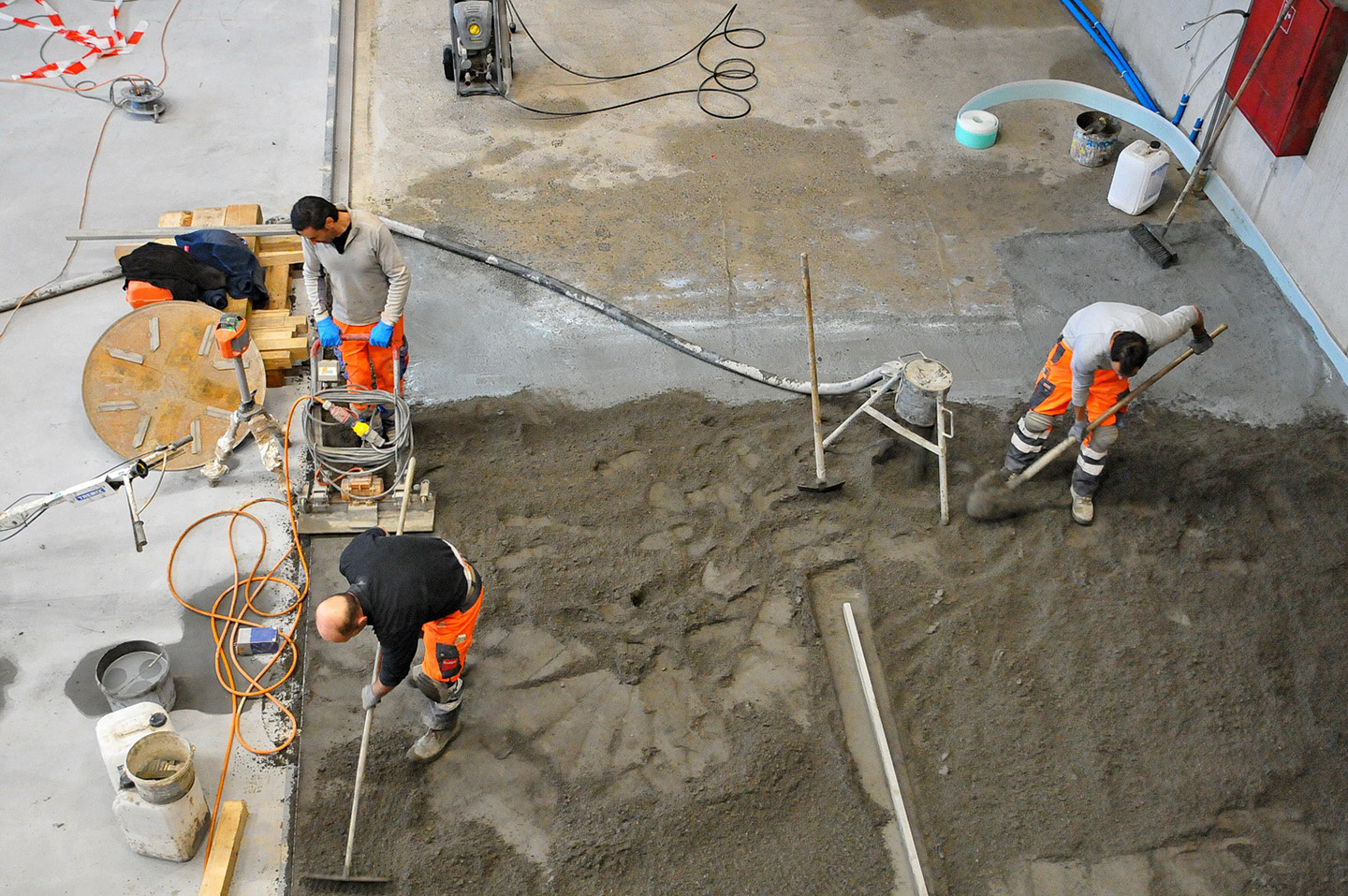 In der Hallenmitte wurde eine 2 cm dicke Schicht aus Hartbeton eingebracht. Diese Betonschicht in der Hallenmitte dient als Ausgleich und wird im Anschluss mit einem Holzboden bedeckt. Wichtig ist dabei eine maximale Toleranz von +/-2mm über die gesamte Schicht, damit später passgenaue Holzelemente auf dem Boden produziert werden können. Der Hartbeton in den seitlichen Fahrgassen ist 10cm dick.