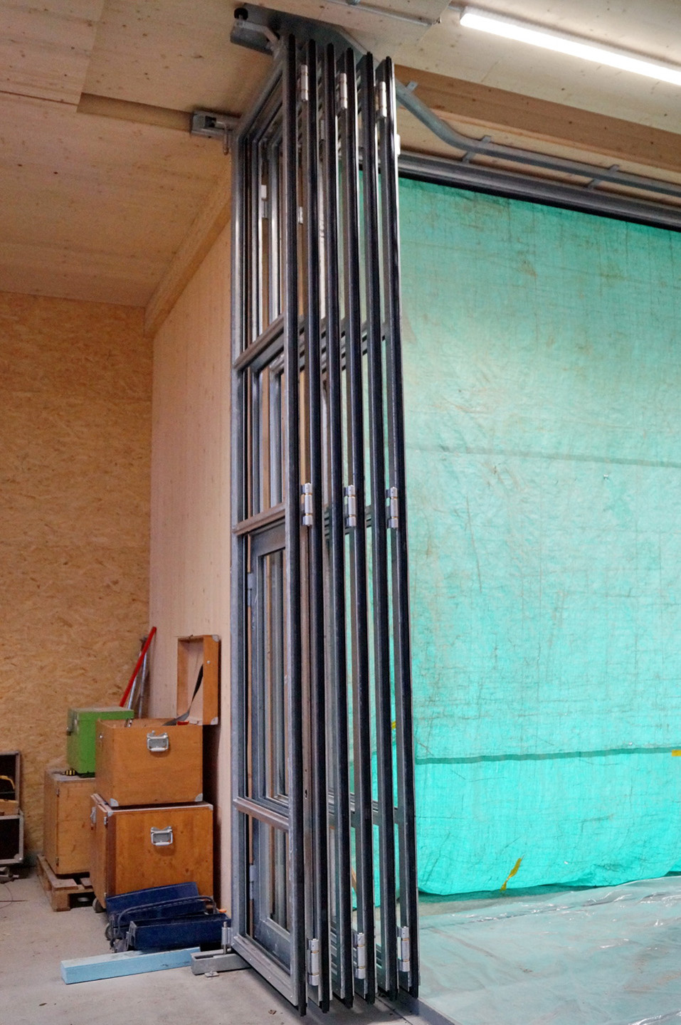Das Faltschiebetor beim Eingang auf der Hallensüdseite ist montiert worden, während gleichzeitig die sanitären Installationen abgeschlossen wurden. Die Leitungen wurden mit einem Polyisocyanurat- oder Polyiso-Hartschaum, kurz PIR überzogen und erhalten somit einen hochwertigen Wärmedämm-Effekt.