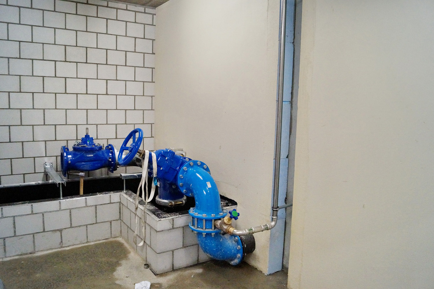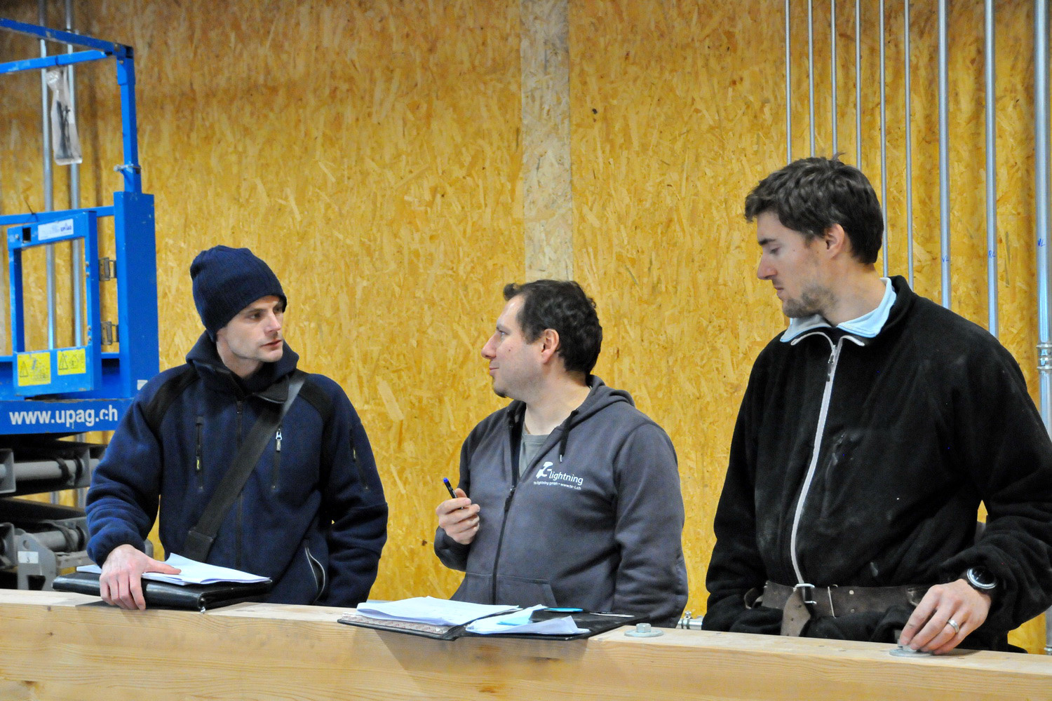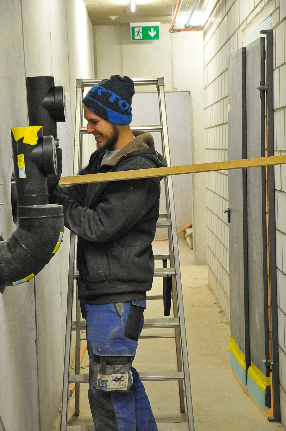 Die Wände an den Betonkernen werden mit Cellulose ausgedämmt. Die gewaltige Wasserzuleitung in die Sprinkleranlage ist fertig eingesetzt worden und konnte schon in Betrieb genommen werden.