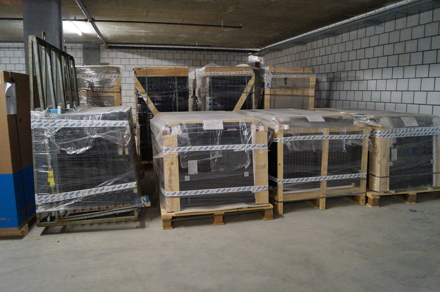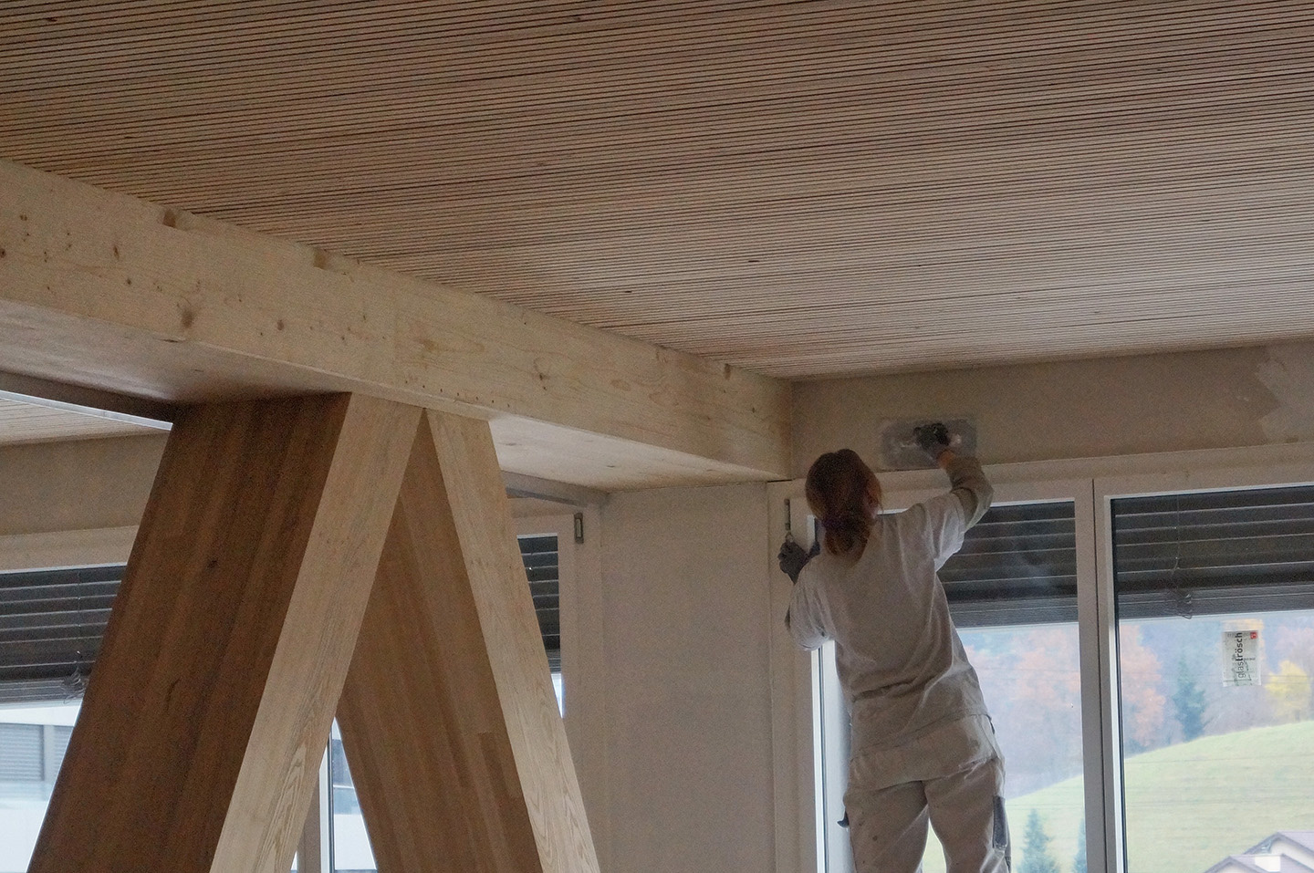 Palettenweise stehen die PV-Panels bereit für eine baldige Montage. Im Innenbereich sind bereits die Gipser am Werk.