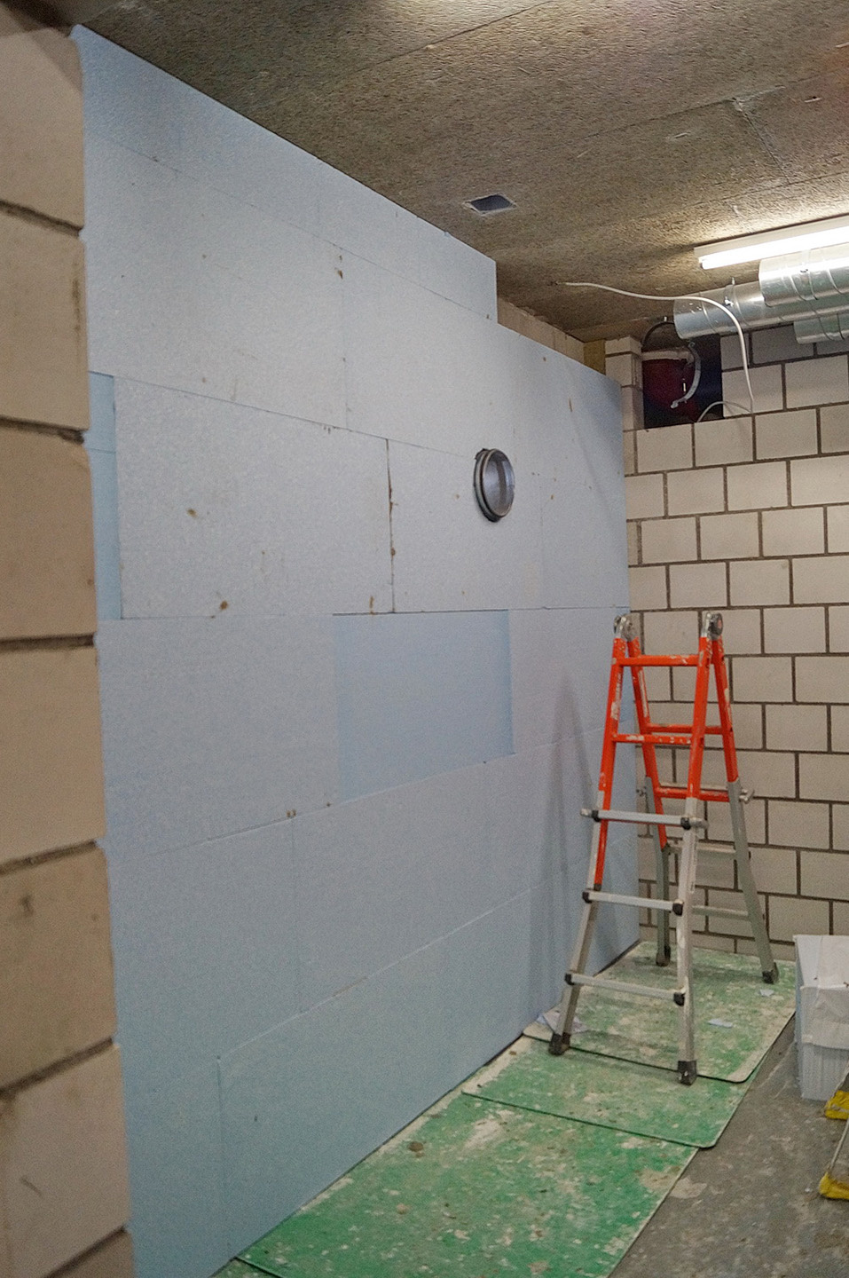 Für die Aussendämmung im Untergeschoss wurde ein extrudiertes Polystyrol, kurz XPS gewählt, welches zu den Polystyrol-Dämmstoffen gehört. Es handelt sich dabei um eine Hartschaumplatte aus Kunststoffgranulat. Wie man sieht, kann der Vakuumsauger für die Belegung des Hallenbodens bereits bestens eingesetzt werden. In den Attika-Wohnräumen ist schon die Schalung montiert.