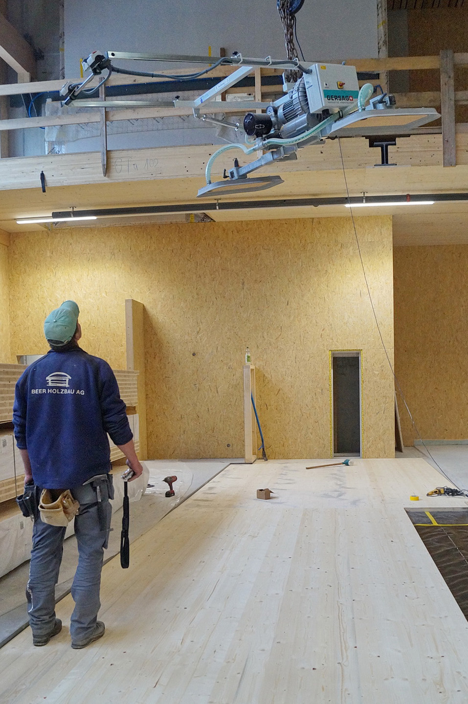 Zudem ist das Substrat für die Dachbegrünung fachmännisch verteilt worden und die im Fachwerk hergestellten Akkustikelemente im Bürogeschoss konnten montiert werden.