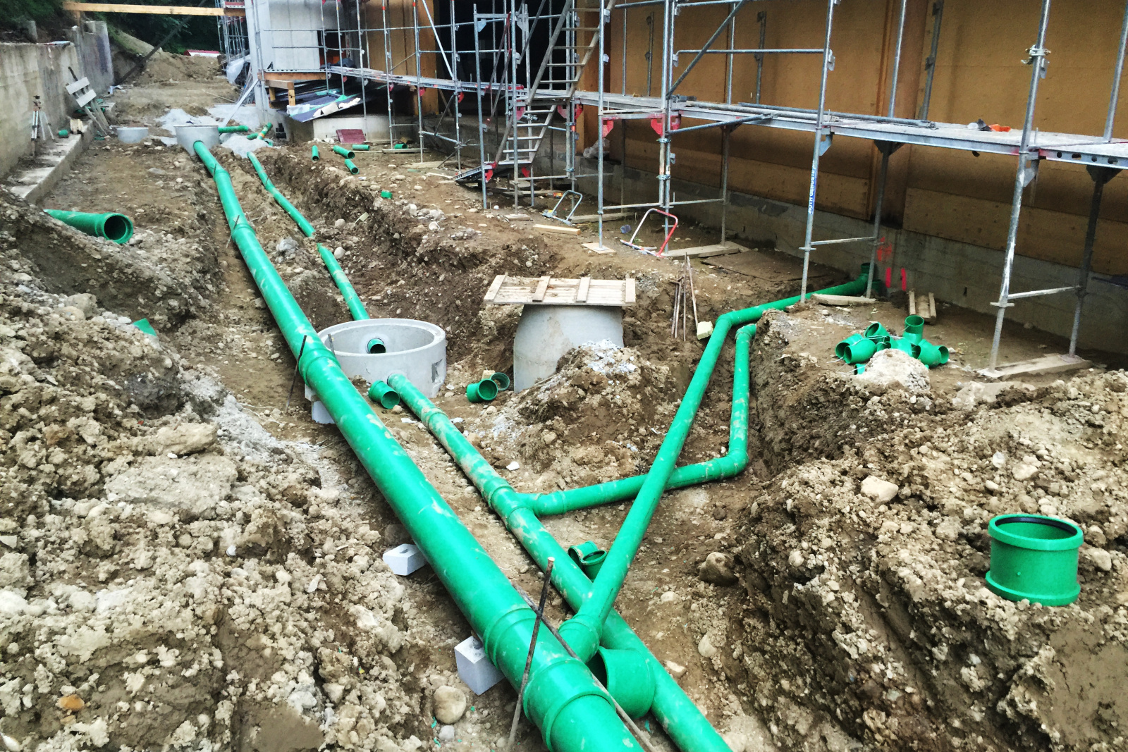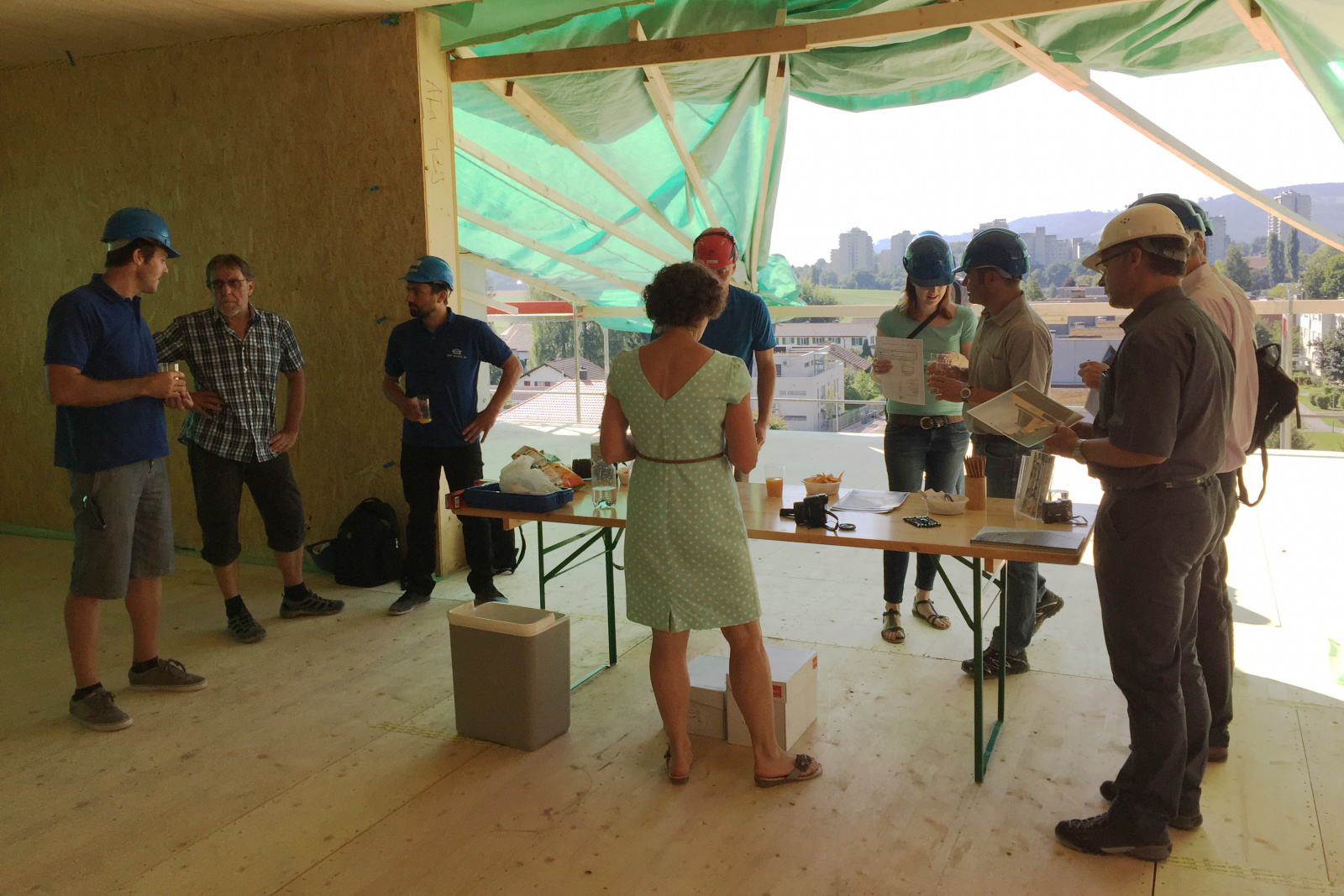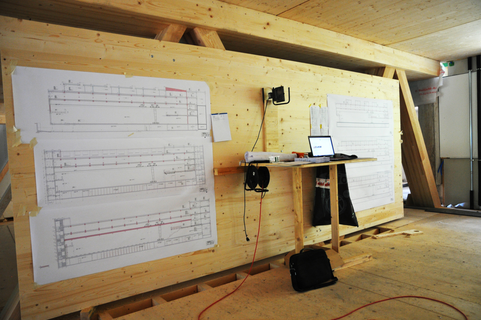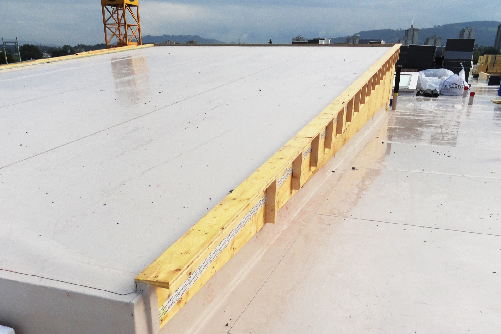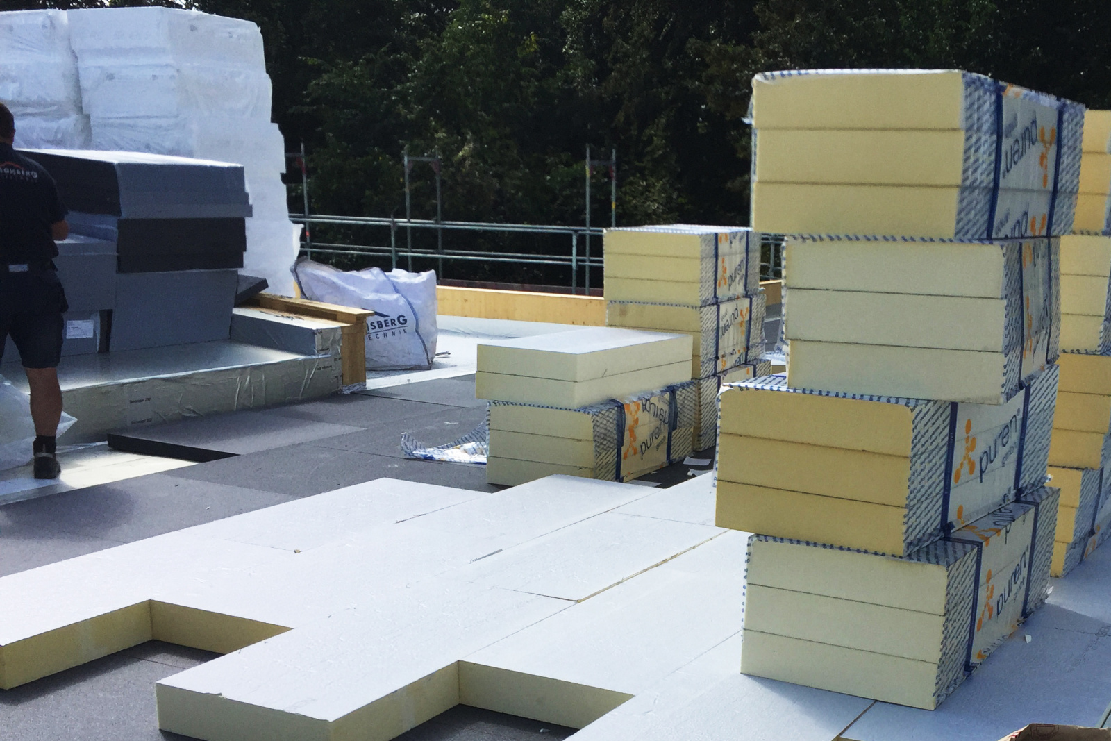 Beginn der Fenstermontage in den Attikawohnungen. Konsequenterweise wurden Schweizer Fenster gewählt. Damit gelingt eine wundervolle Weitsicht über Ostermundigen in die Berner Alpen. Auf der Westseite der Halle wurde die Kanalisation fertig gestellt, sowie mit der Vordachmontage begonnen. Die Flachdacharbeiten der Attikaterrassen und des Hauptdachs sowie die Bauzeitabdichtung sind fertiggestellt. Die Winddichtigkeit ist Dank der Pavatherm-Dichtung an der Fassade abgeschlossen und alle Stösse bis zum 3. OG sind geschlossen und mit Kalksplit gefüllt worden. Die Fassade ist nun dicht! Auch die Kabel sind im FachWerk bereits eingezogen worden durch BKW und Cablecom.