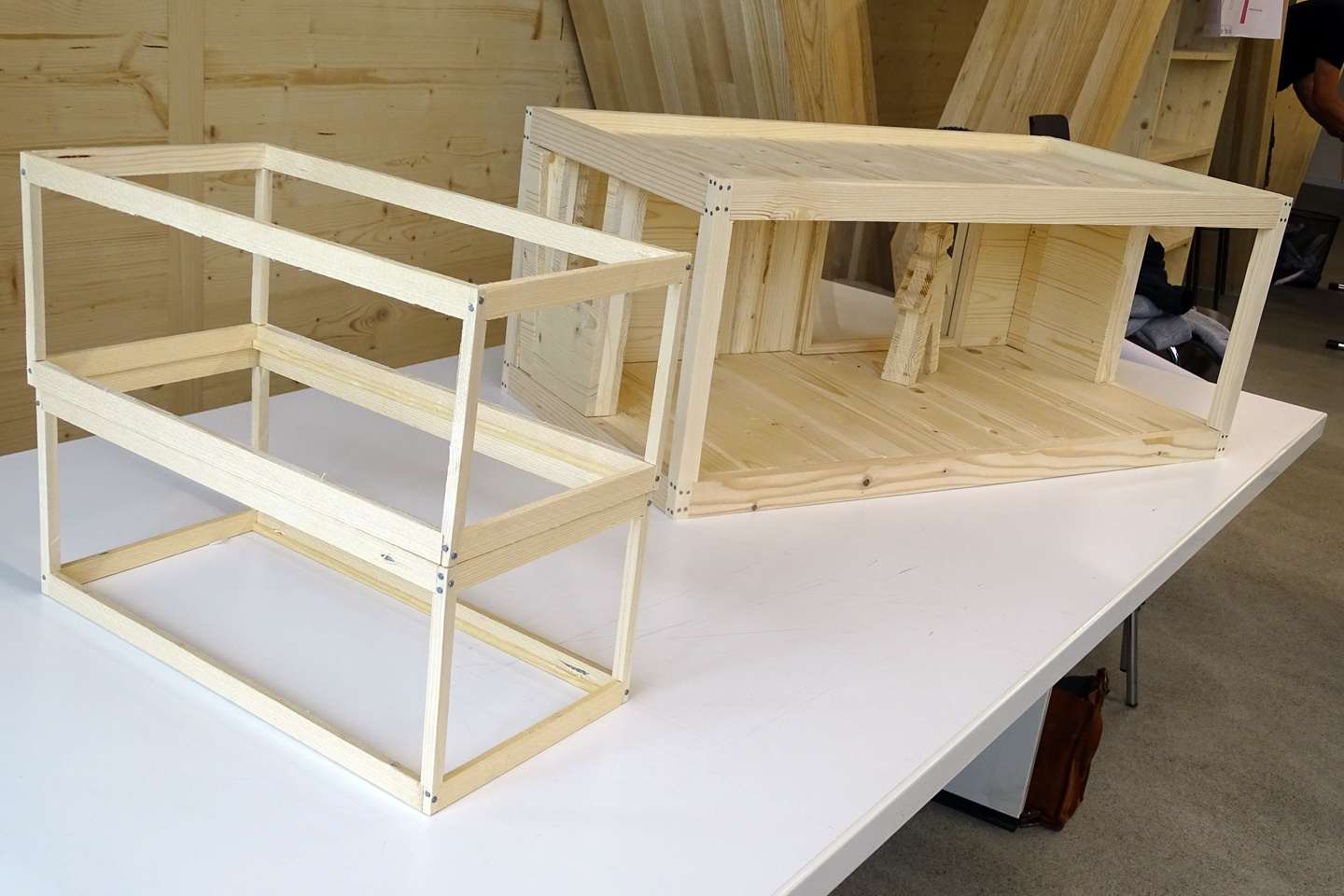 Die Gruppe «Mainframe» hat ein Modul aus Laubholz entwickelt, welches möglichst weit vorgefertigt werden kann. Es besteht aus Rahmen- sowie Wand- und Dachelementen, die beispielsweise in Katastrophengebieten in zwei Etappen errichtet werden könnten. Das Rahmenmodul könnte zu Beginn mit Zeltstoff bezogen und erst in einem zweiten Schritt mit den Wand- und Deckenelementen ergänzt werden.