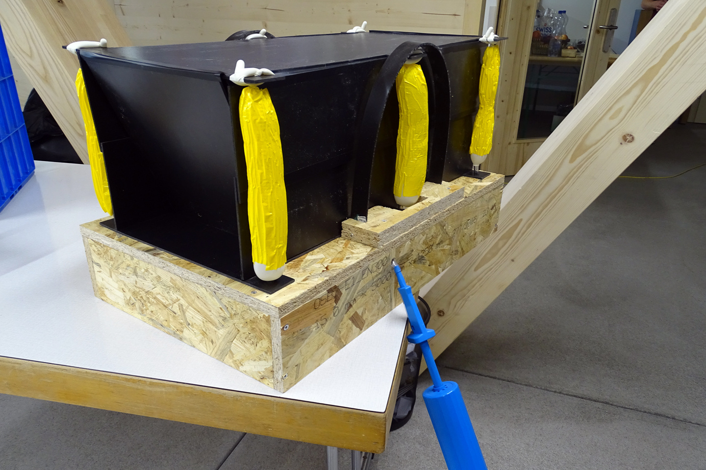 Beim Projekt der Gruppe «Faltwerk» wird Luft in die seitlich und in den Ecken angebrachten Ballone gepumpt. So kann das Modul sehr rasch aufgestellt werden und ist einfach transportierbar.