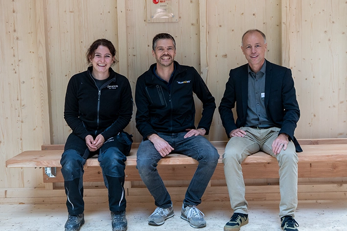 Am Nachmittag durften wir unsere VIP-Gäste begrüssen. Gemeinsam fuhren wir mit dem Car zu allen drei Standorten. Im Wald wurde die nachhaltige Waldbewirtschaftung anschaulich vorgestellt, und feierlich weihten wir die provisorische RBS-Bushaltestelle ein, die während der Woche der TdsH gemeinsam mit der Zimmerin on Tour produziert und aufgerichtet worden war. In der OLWO AG erhielten die Gäste einen exklusiven Einblick ins Sägewerk im laufenden Betrieb, bevor der Tag bei uns in Ostermundigen seinen Höhepunkt fand. Nach einer Führung durch den Betrieb folgte ein eindrückliches Referat von Dr. Prof. Heinz Wanner zum Thema «Das Klima im dauernden Wandel – der Wald zieht mit». Den gelungenen Abschluss bildeten ein reichhaltiger Apéro Riche und anregende Gespräche in unserer Produktionshalle.