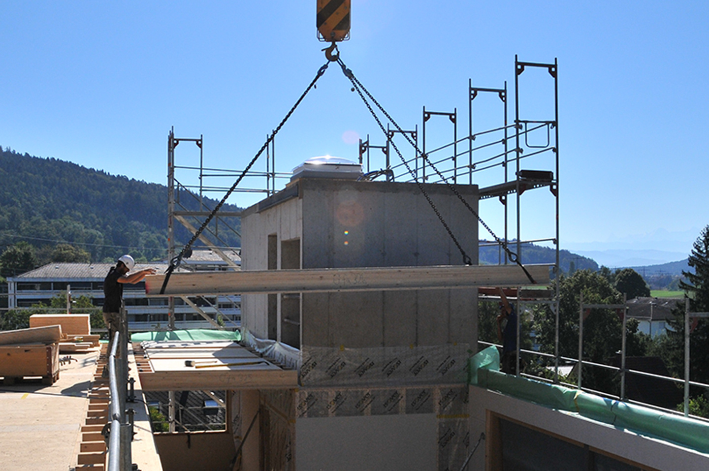 Die letzten Träger und Elemente werden angeliefert, mit Hilfe des Krans platziert und millimetergenau montiert.