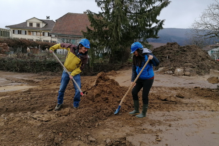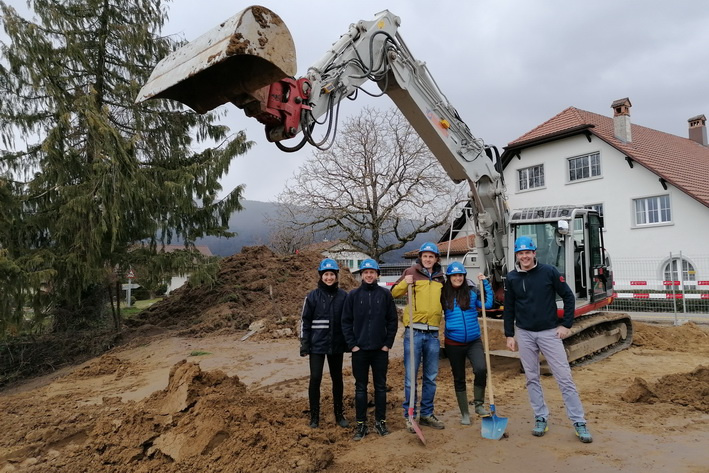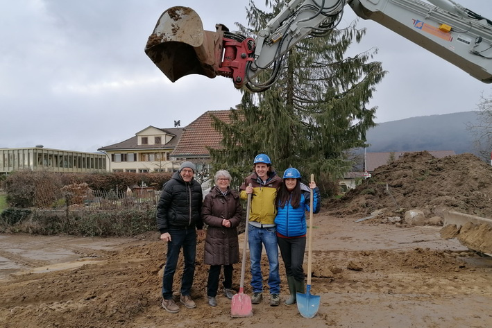 Der symbolische Spatenstich. Das Ausheben einer Schaufel Erde auf dem eigenen Grundstück ist der Höhepunkt zum Start vom Bau des eigenen Hauses jeder Baufamilie. So auch für die junge Familie in Sutz-Lattrigen.