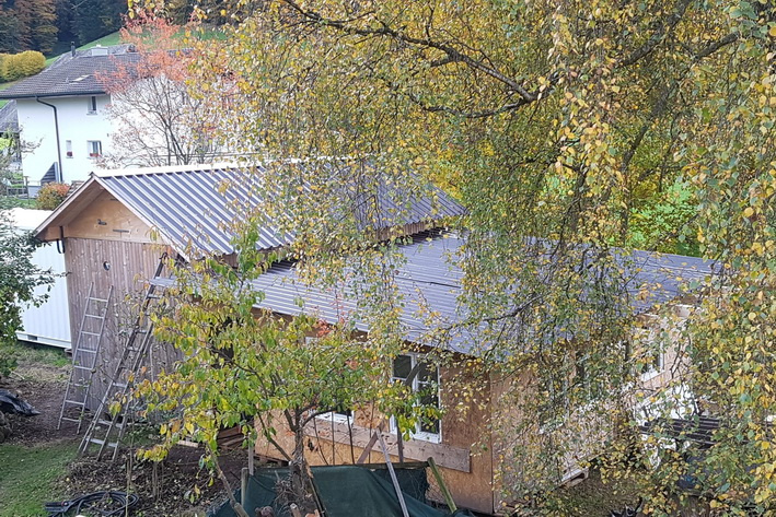 Rechtzeitig vor dem Wintereinbruch haben wir das Modul  an einem Tag wieder zerlegt, mit dem Heli ins Tal geflogen und abtransportiert zurück ins Emmental. Schon eine Woche später stand das Kleinsthaus erneut. In Lützelflüh direkt am Bach hatten wir es wieder aufgebaut. Für rund ein Jahr bietet es hier nun das Zuhause für eine Baufamilie. Hier wird wieder gebaut, ein Einfamilienhaus wird weichen und ein Ersatzneubau wird in Zukunft auf der gleichen Parzelle gleich 3 Familien aufnehmen. Die Nähe zur Baustelle ist für den Bauherrn die optimale Situation, schliesslich soll ein grosser Teil der Arbeiten in Eigenleistung realisiert werden.