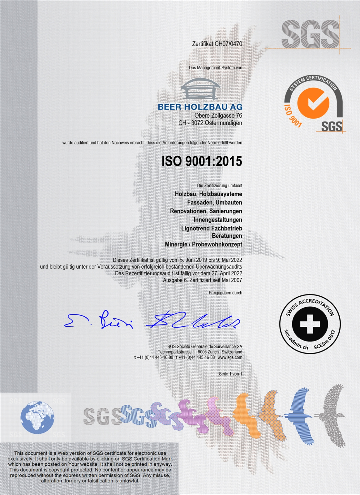 Im April 2019, anlässlich der ISO-Rezertifizierung konnten wir beweisen, dass wir die hohen Anforderungen der ISO 9001:2015 vollumfänglich erfüllen. Unter der Voraussetzung von erfolgreich bestandenen Überwachungsaudits ist Beer Holzbau nun bis 2022 zertifiziert in den Bereichen