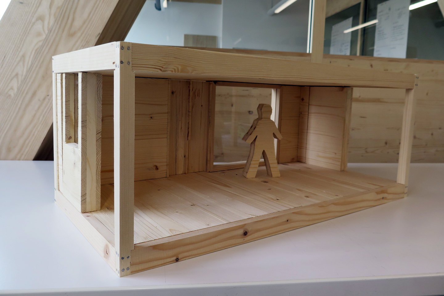 Die Gruppe «Mainframe» hat ein Modul aus Laubholz entwickelt, welches möglichst weit vorgefertigt werden kann. Es besteht aus Rahmen- sowie Wand- und Dachelementen, die beispielsweise in Katastrophengebieten in zwei Etappen errichtet werden könnten. Das Rahmenmodul könnte zu Beginn mit Zeltstoff bezogen und erst in einem zweiten Schritt mit den Wand- und Deckenelementen ergänzt werden.