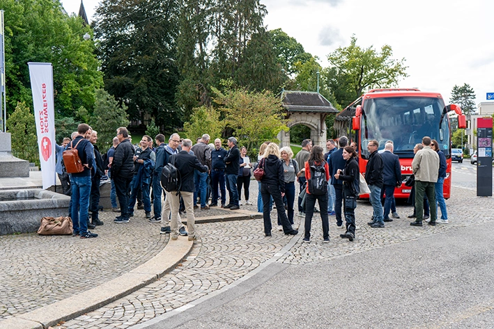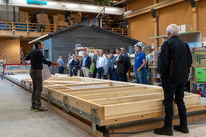 Am Nachmittag durften wir unsere VIP-Gäste begrüssen. Gemeinsam fuhren wir mit dem Car zu allen drei Standorten. Im Wald wurde die nachhaltige Waldbewirtschaftung anschaulich vorgestellt, und feierlich weihten wir die provisorische RBS-Bushaltestelle ein, die während der Woche der TdsH gemeinsam mit der Zimmerin on Tour produziert und aufgerichtet worden war. In der OLWO AG erhielten die Gäste einen exklusiven Einblick ins Sägewerk im laufenden Betrieb, bevor der Tag bei uns in Ostermundigen seinen Höhepunkt fand. Nach einer Führung durch den Betrieb folgte ein eindrückliches Referat von Dr. Prof. Heinz Wanner zum Thema «Das Klima im dauernden Wandel – der Wald zieht mit». Den gelungenen Abschluss bildeten ein reichhaltiger Apéro Riche und anregende Gespräche in unserer Produktionshalle.