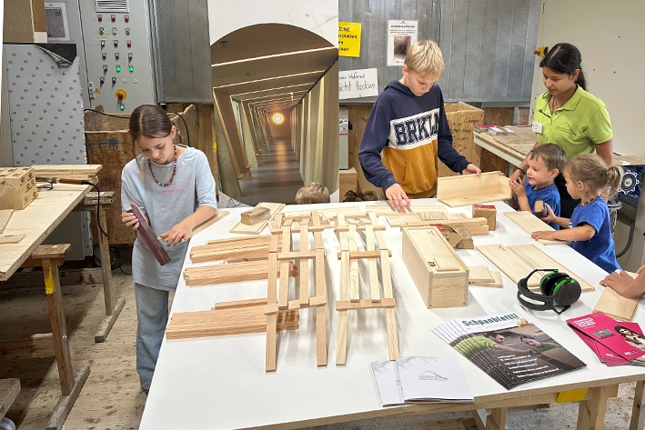 Der Auftakt erfolgte am Freitagmorgen: Zwei Schulklassen erhielten im Wald und bei uns in Ostermundigen spannende Einblicke in die Welt der Holzberufe. Mit grosser Begeisterung durften die Schülerinnen und Schüler auch selbst Hand anlegen und das Material Holz hautnah erleben.