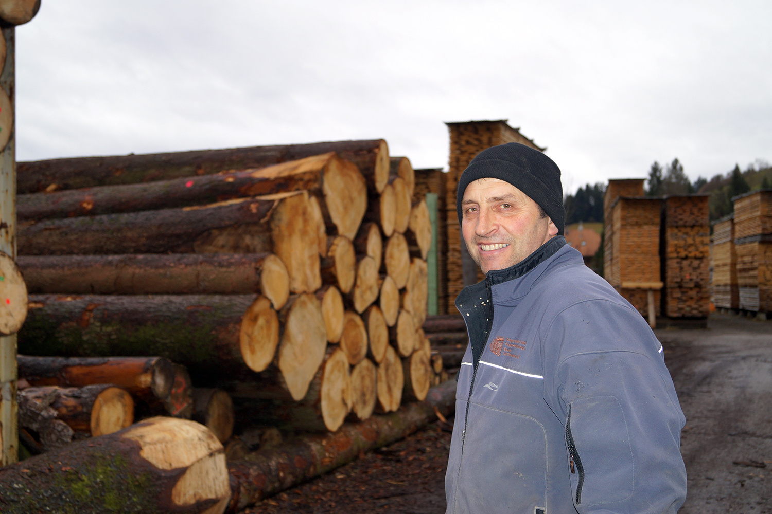 Gleichzeitig wurde das im Dezember geschlagene Holz aus unseren Emmentaler Wäldern in der Sägerei Küpfer, Schwanden i.E., eingeschnitten und zum Trocknen gestapelt.