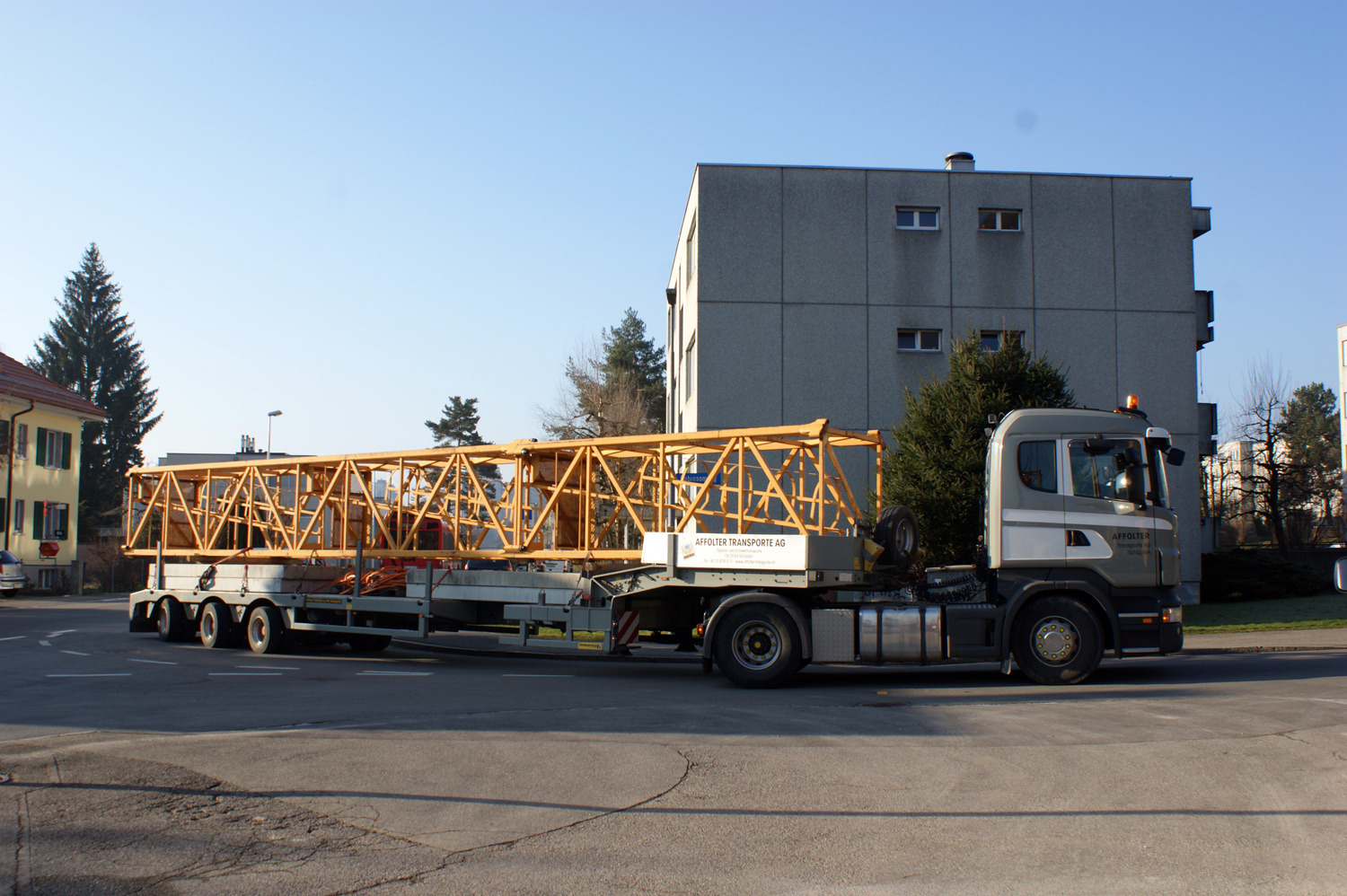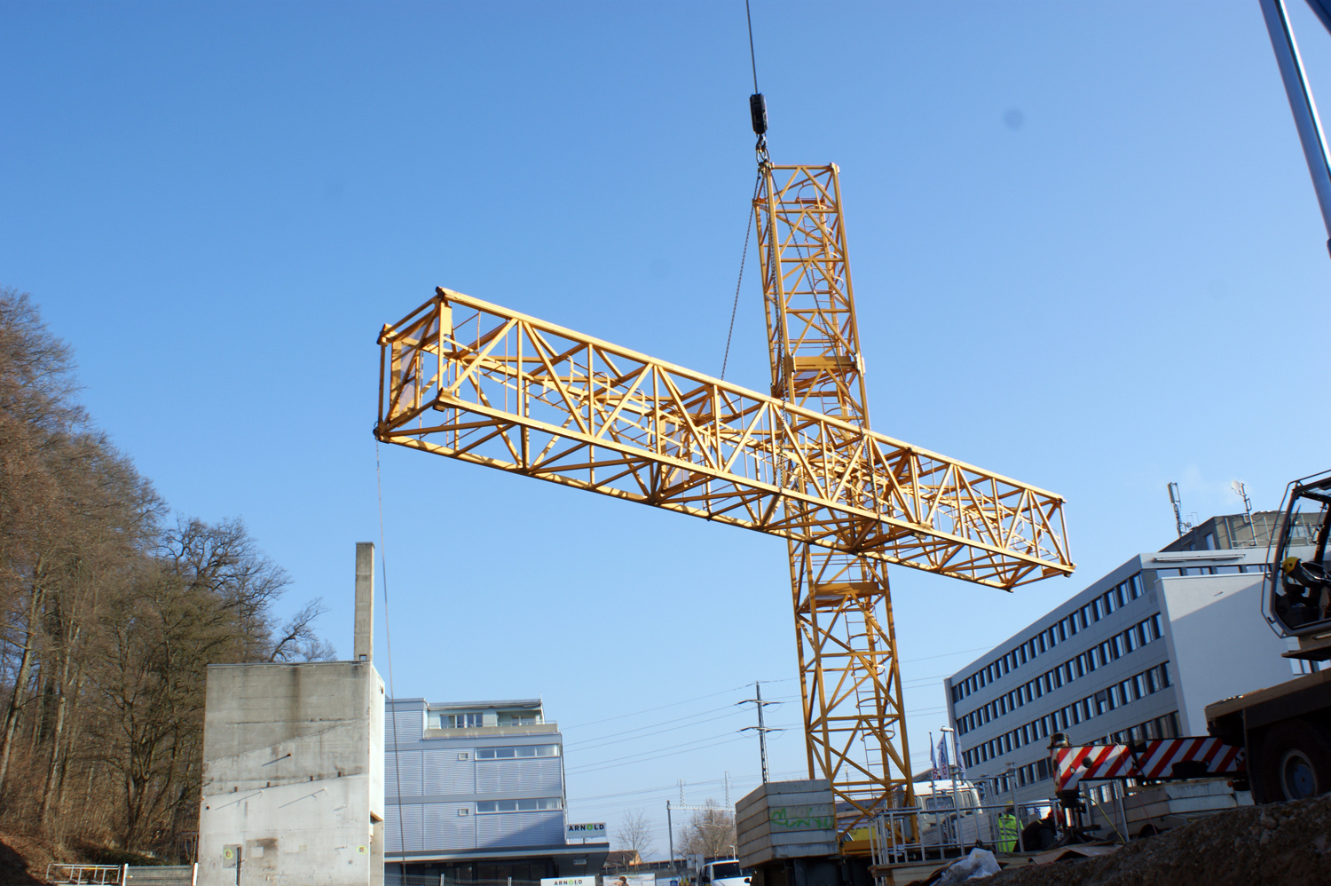 Der grosse Baukran erhielt ein eigenes und solides Betonfundament. Der 29.5m hohe Baukran mit seinem 50m langen "Ausleger" wurde am 17.03.2016 aufgestellt und in Betrieb genommen. Gleichzeitig konnte auch die Infrastruktur der Firma Marti auf dem Bauplatz beginnen.
