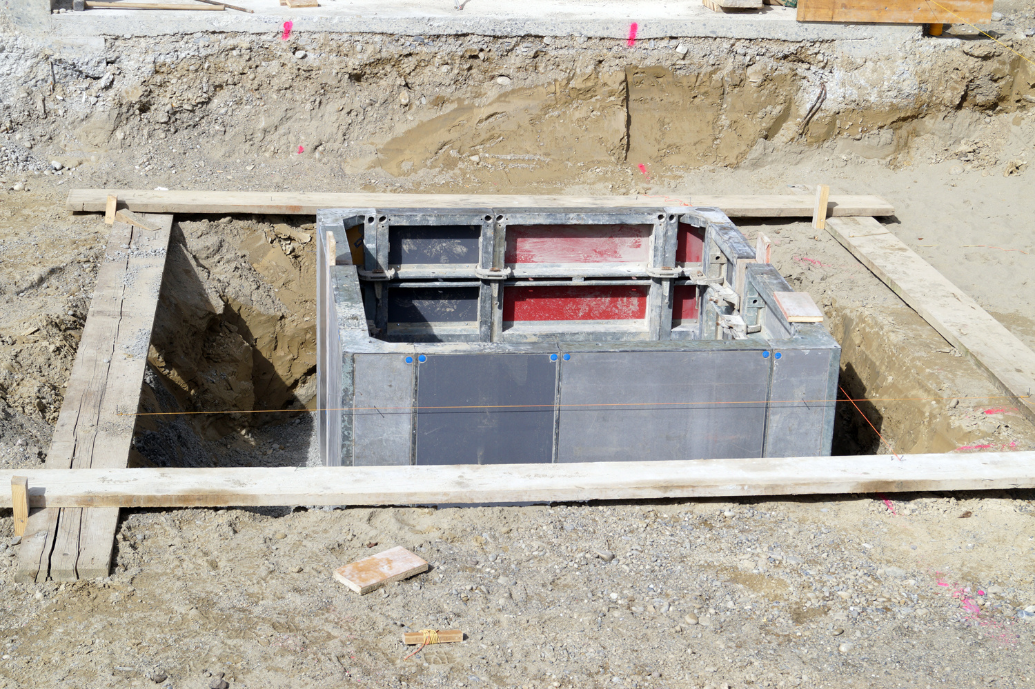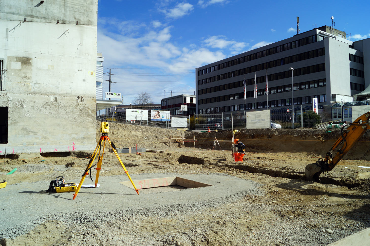 Der Baumeister startete mit dem Verlegen der Kanalisation und erstellte die ersten Stützenfundamente, welche später die Lasten aus dem Gebäude auf das Erdreich übertragen. Auf die bestehende Aushubsohle wurde Magerbeton verteilt und verdichtet, damit später die Bodenplatte darauf betoniert werden kann.