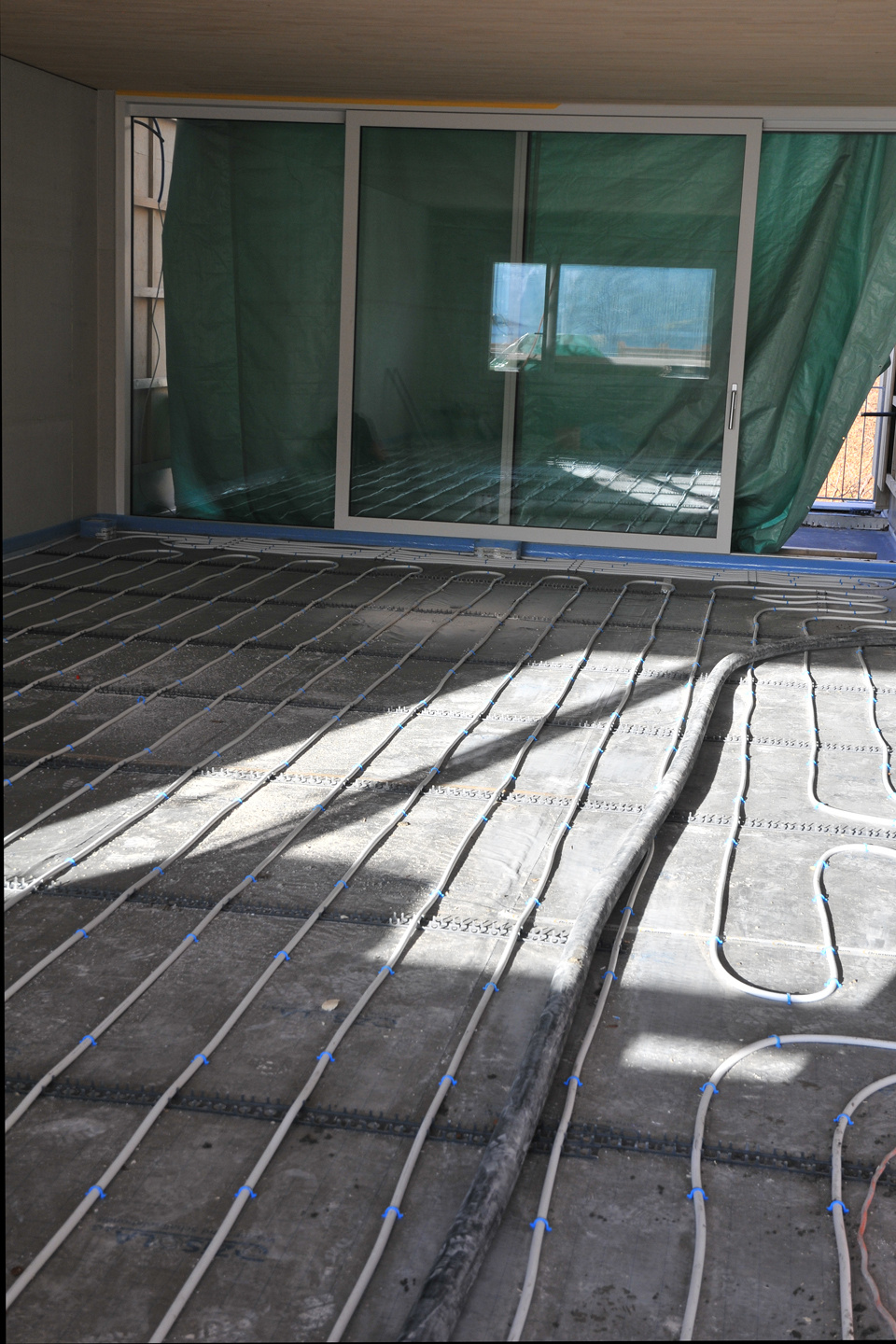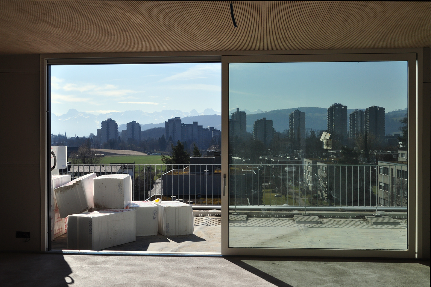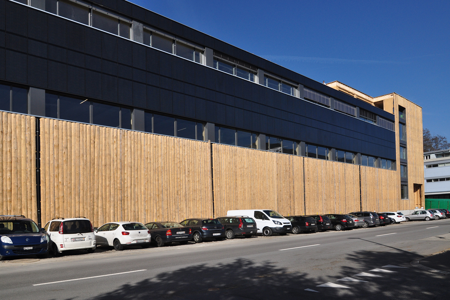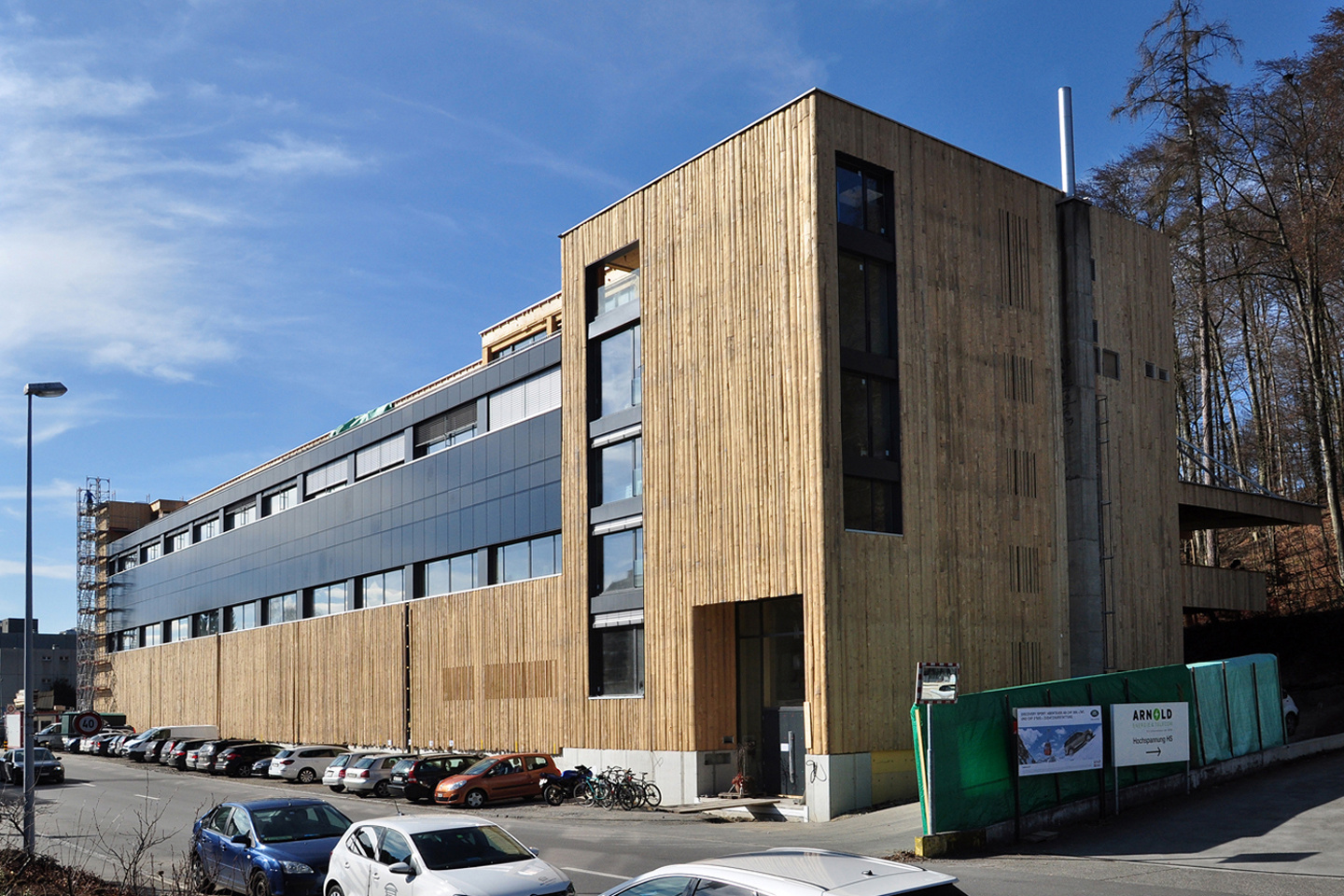 Die Photovoltaik-Anlage wurde angeschlossen und ist am Netz. Die Gerüste an der Nordseite des Gebäudes konnten demontiert werden. In den Attika-Wohnungen wurde mit der Beplankung der innenwände begonnen. In zwei Wohnungen ist der Unterlagsboden fertiggestellt worden. Die Fassade mit der besonderen Schwartenschalung wurde auf der Nordseite der Halle abgeschlossen.