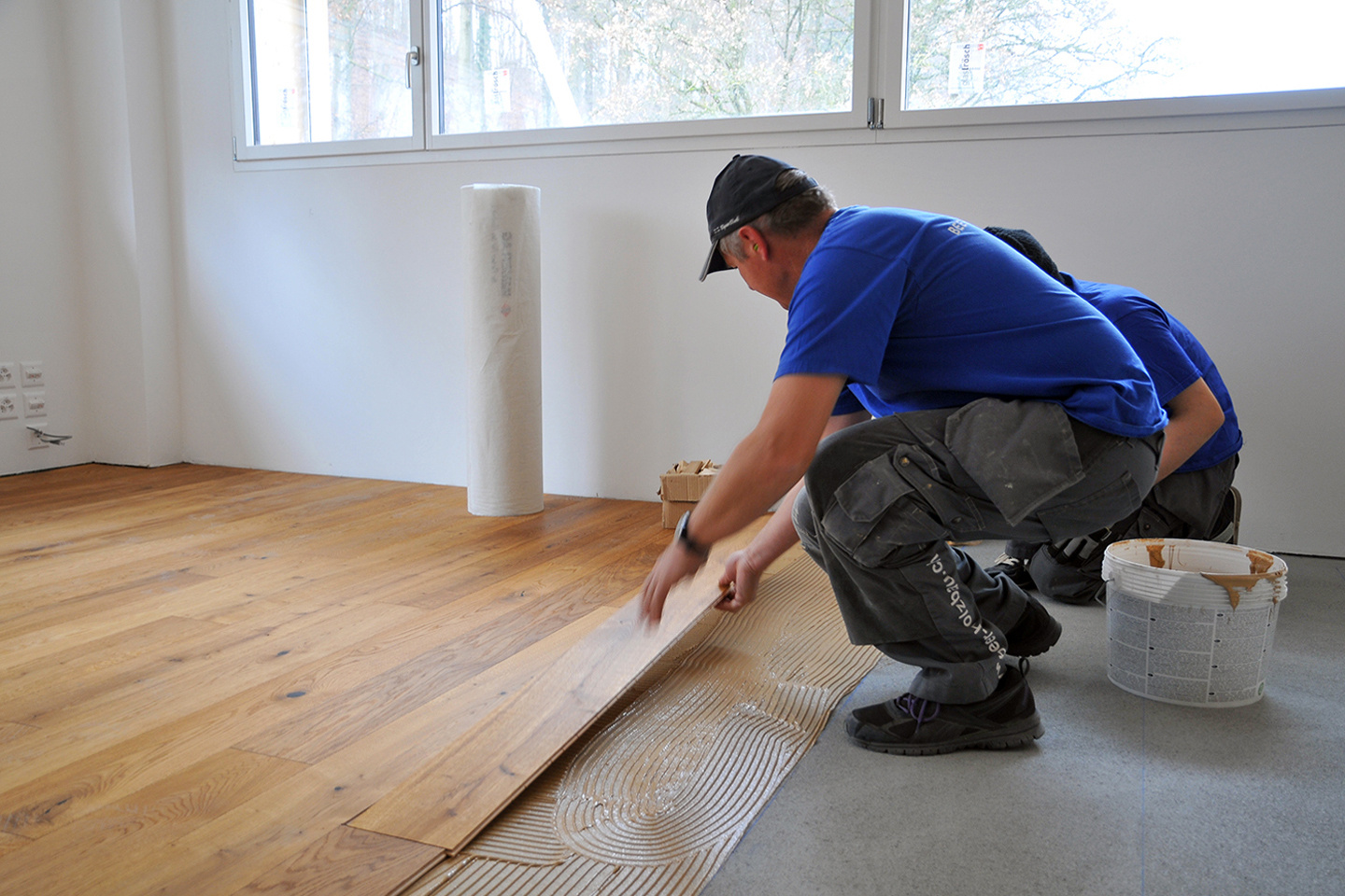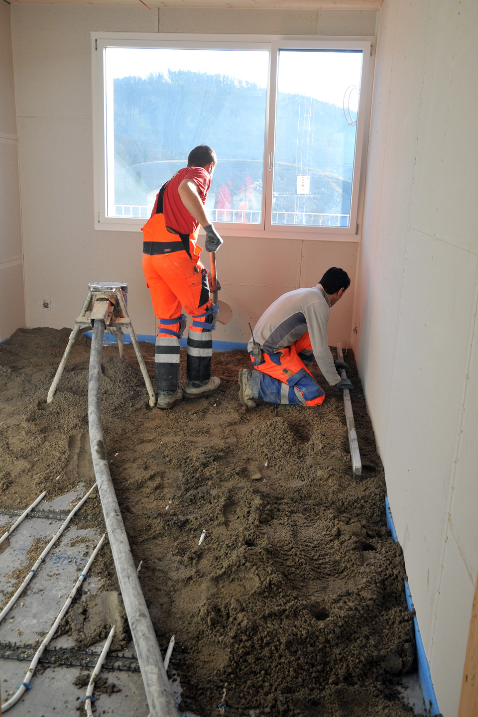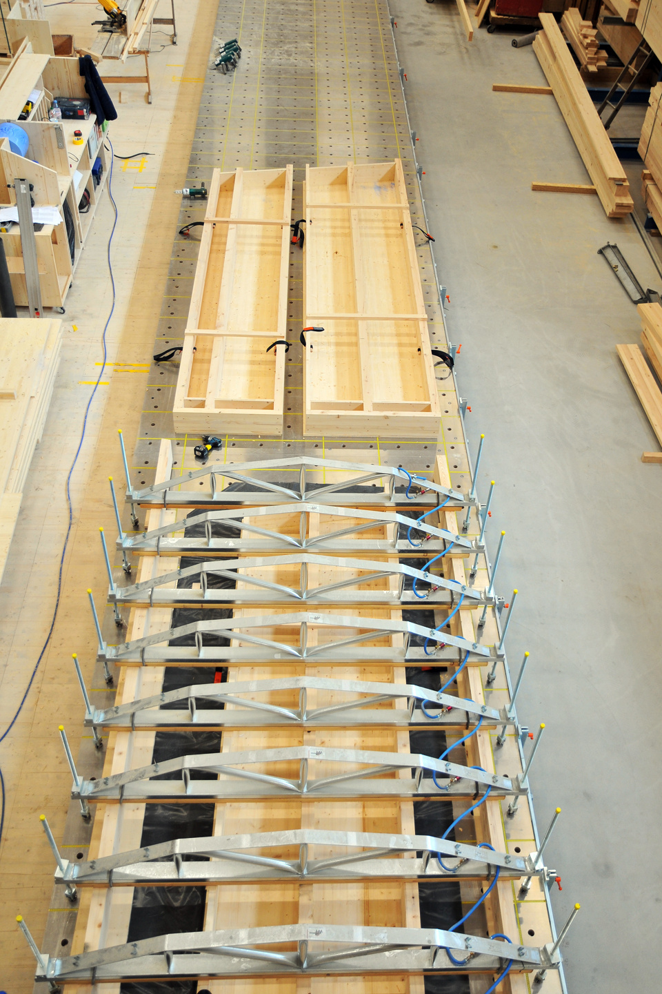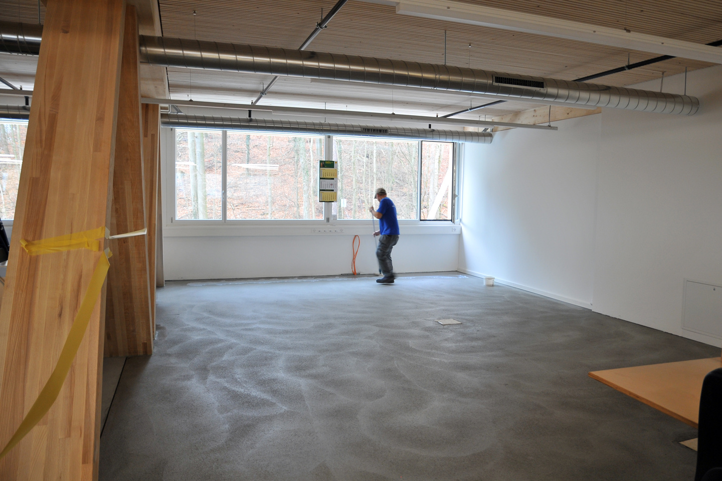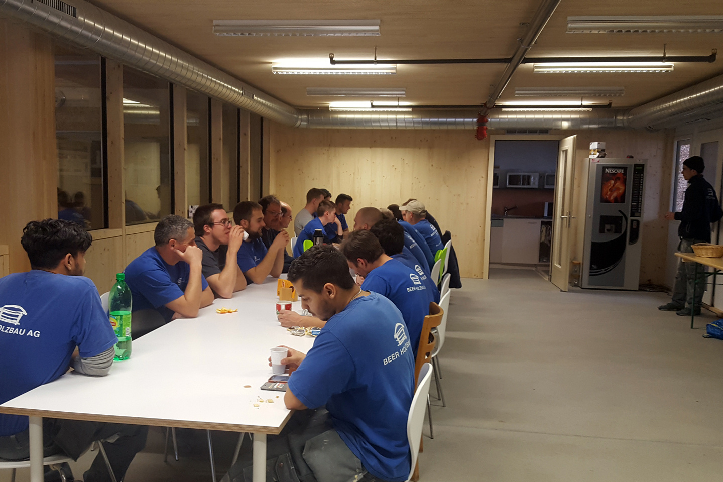 Die Photovoltaik-Anlage wurde angeschlossen und ist am Netz. Die Gerüste an der Nordseite des Gebäudes konnten demontiert werden. In den Attika-Wohnungen wurde mit der Beplankung der innenwände begonnen. In zwei Wohnungen ist der Unterlagsboden fertiggestellt worden. Die Fassade mit der besonderen Schwartenschalung wurde auf der Nordseite der Halle abgeschlossen.
