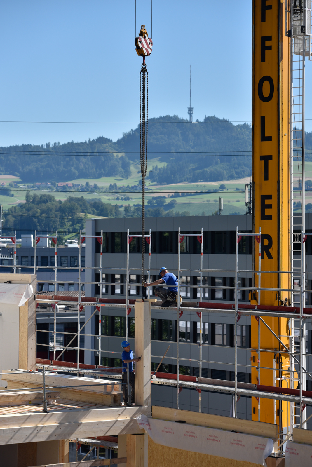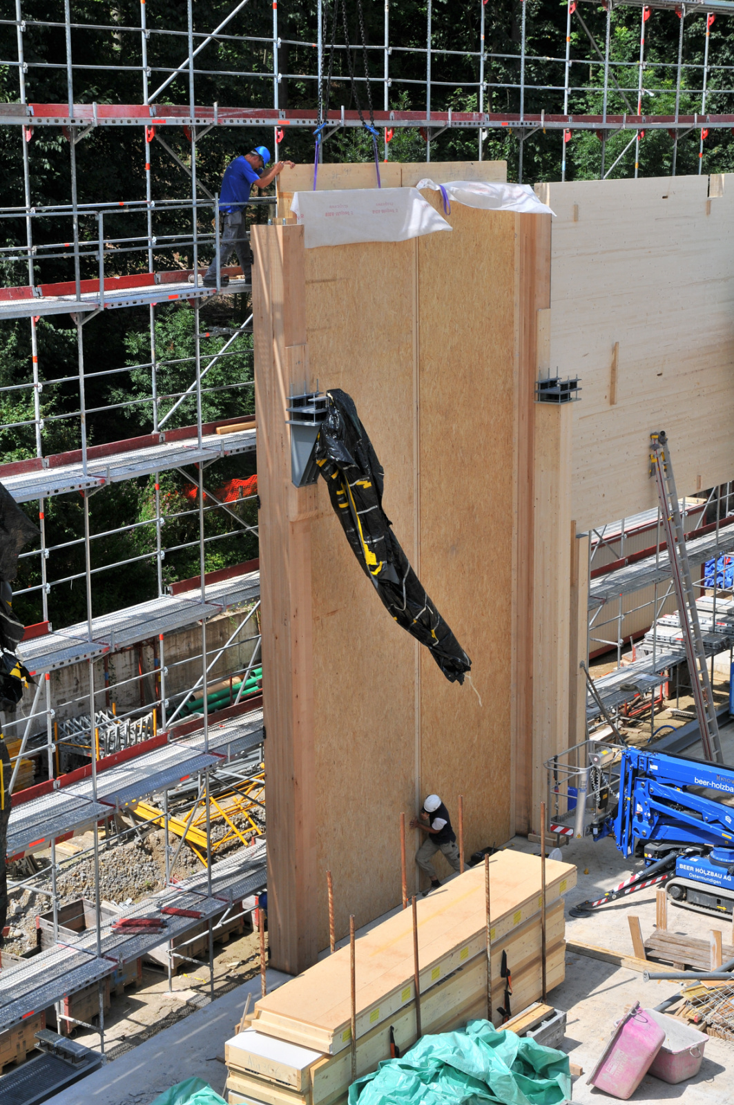 Für den Erneuerungsbau «FachWerk» der Beer Holzbau AG wurden 10 Binder à je 23 Meter länge und mit einem Gewicht von je 10 Tonnen in Ostermundigen angeliefert. Die Binder wurden mithilfe eines 130-Tonnen-Krans vom Schwertransporter entladen und in 10 Metern Höhe montiert.