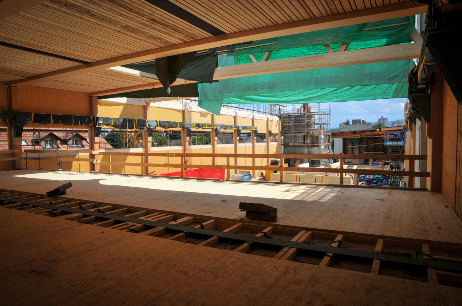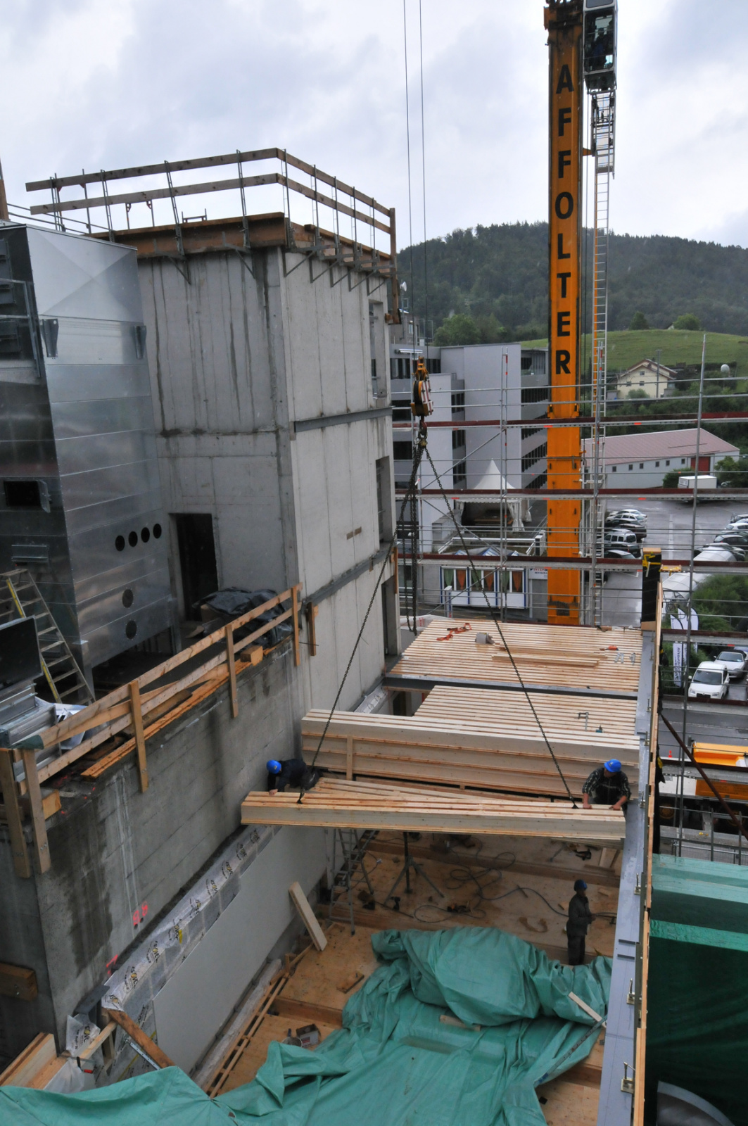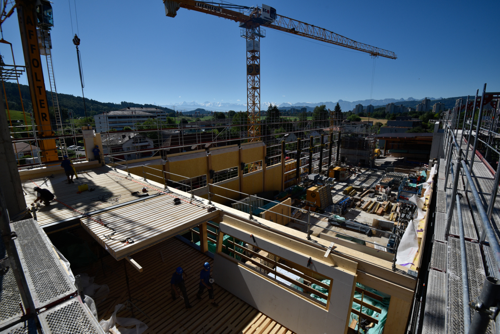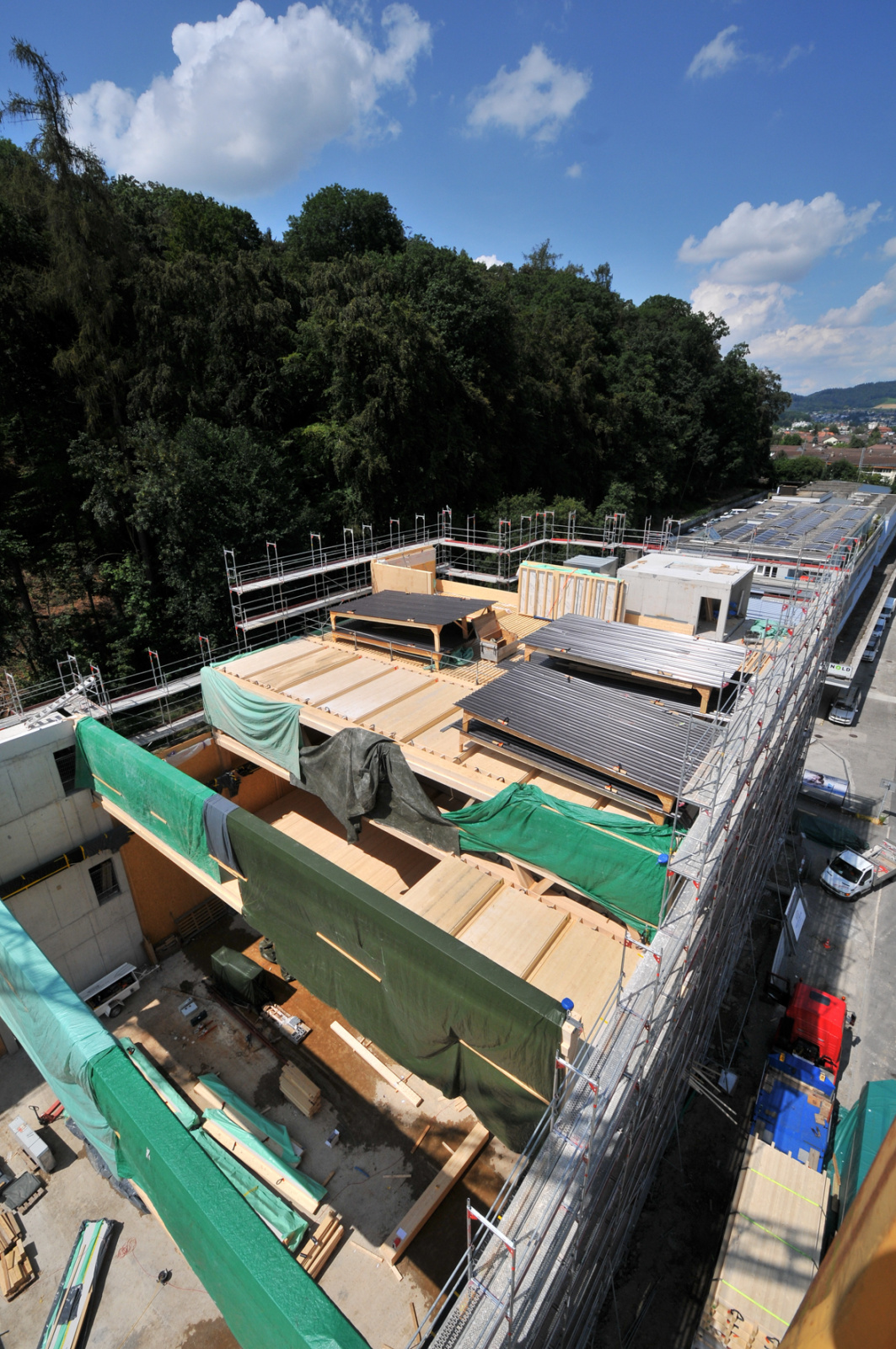Jetzt sind die Zimmerleute definitiv auf die Baustelle gezogen. Gestartet wurde mit der Montage der insgesamt 213 Wandelemente im Maschinenraum.