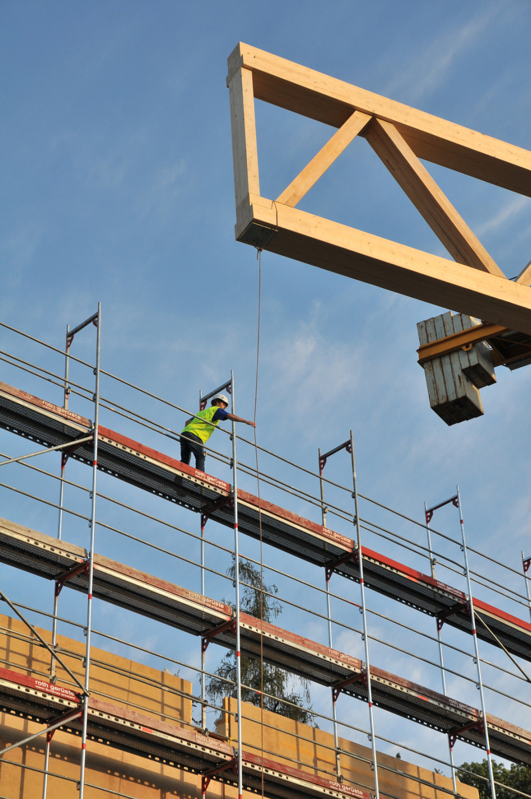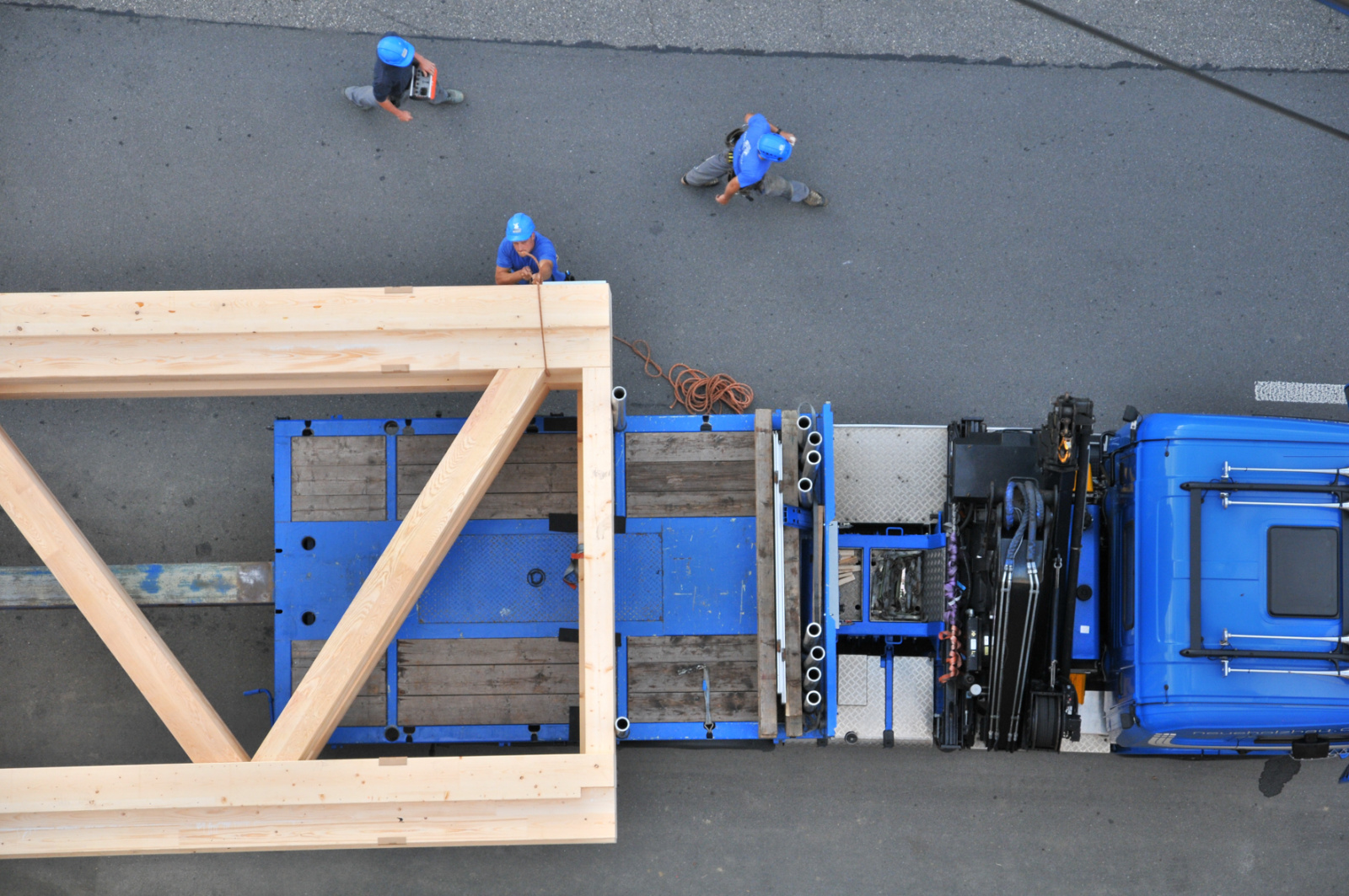Anlieferung und Montage der Fachwerkträger.