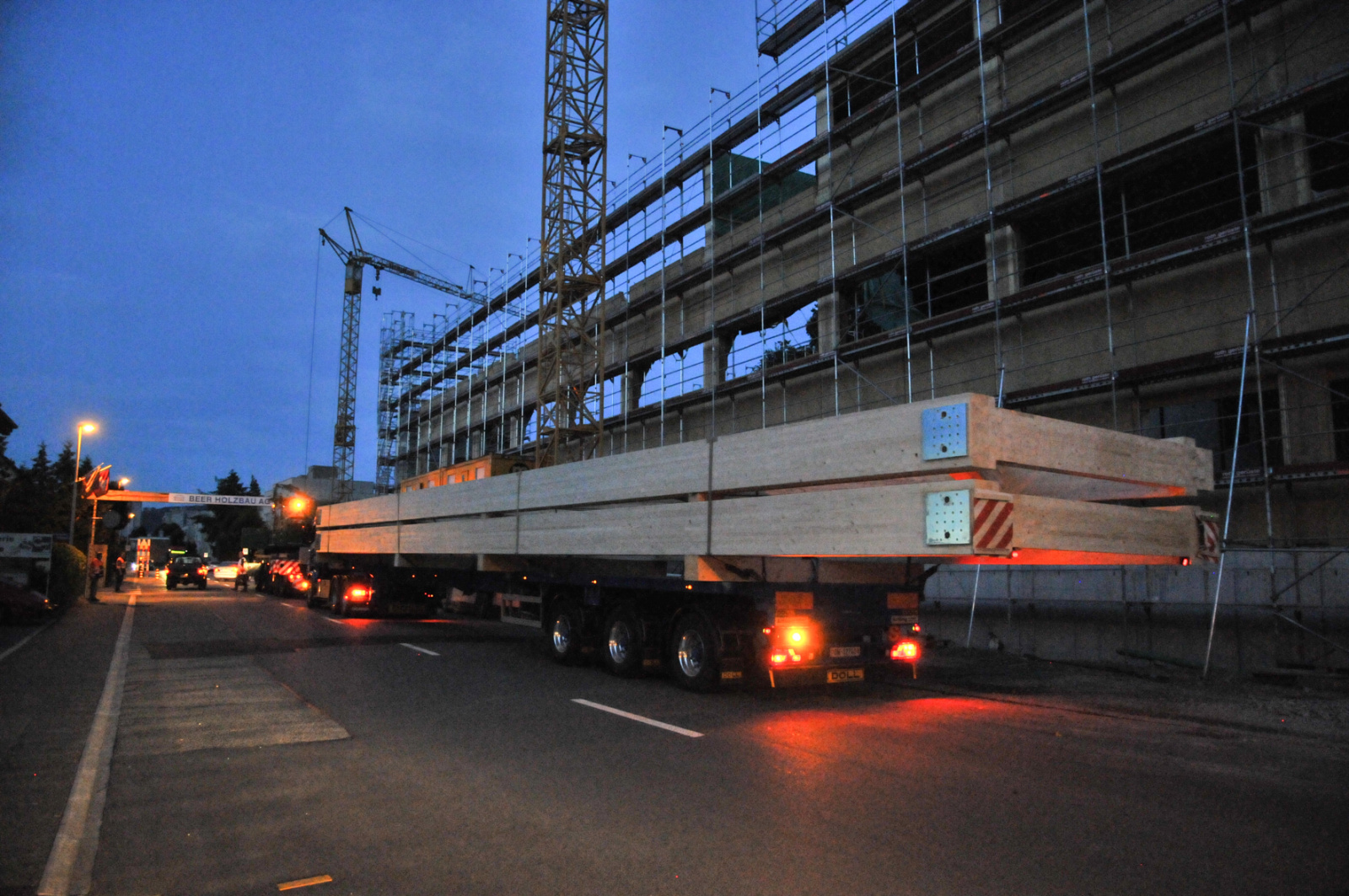 Bei ihrer Ankunft in Ostermundigen hatten die Holzkonstruktionen bereits einen langen Weg hinter sich. Von Lungern (OW) wurden sie via Brünig mit einem Schwertransport an den Thunersee gebracht. Die Strecke wurde abschnittsweise von der Polizei gesperrt, verlief aber problemlos.