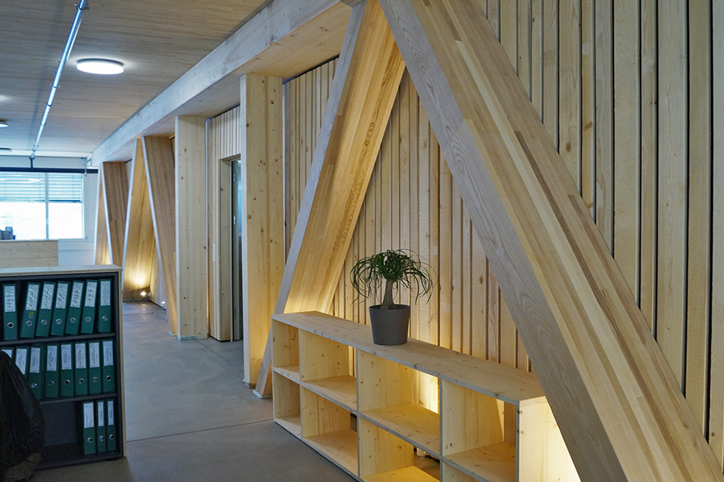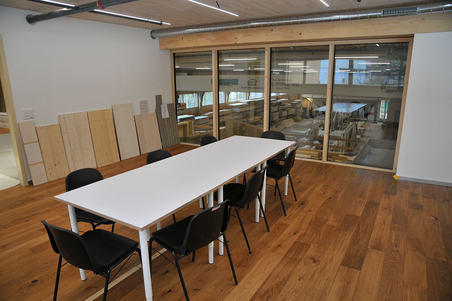 Im gesamten Gebäude sind nun die Böden fertiggestellt. Das Verkaufsbüro im zweiten Obergeschoss ist nun definitiv bereit für Gespräche mit Kunden und Partnern; durch grosse Fenster hat man eine direkte Sicht auf die Produktion im Erdgeschoss des FachWerks. Im Bürobereich sind die letzten Möbel angekommen und aufgestellt worden. Die Einrichtung des Bereichs Administration im dritten Obergeschoss ist somit ebenfalls abgeschlossen.