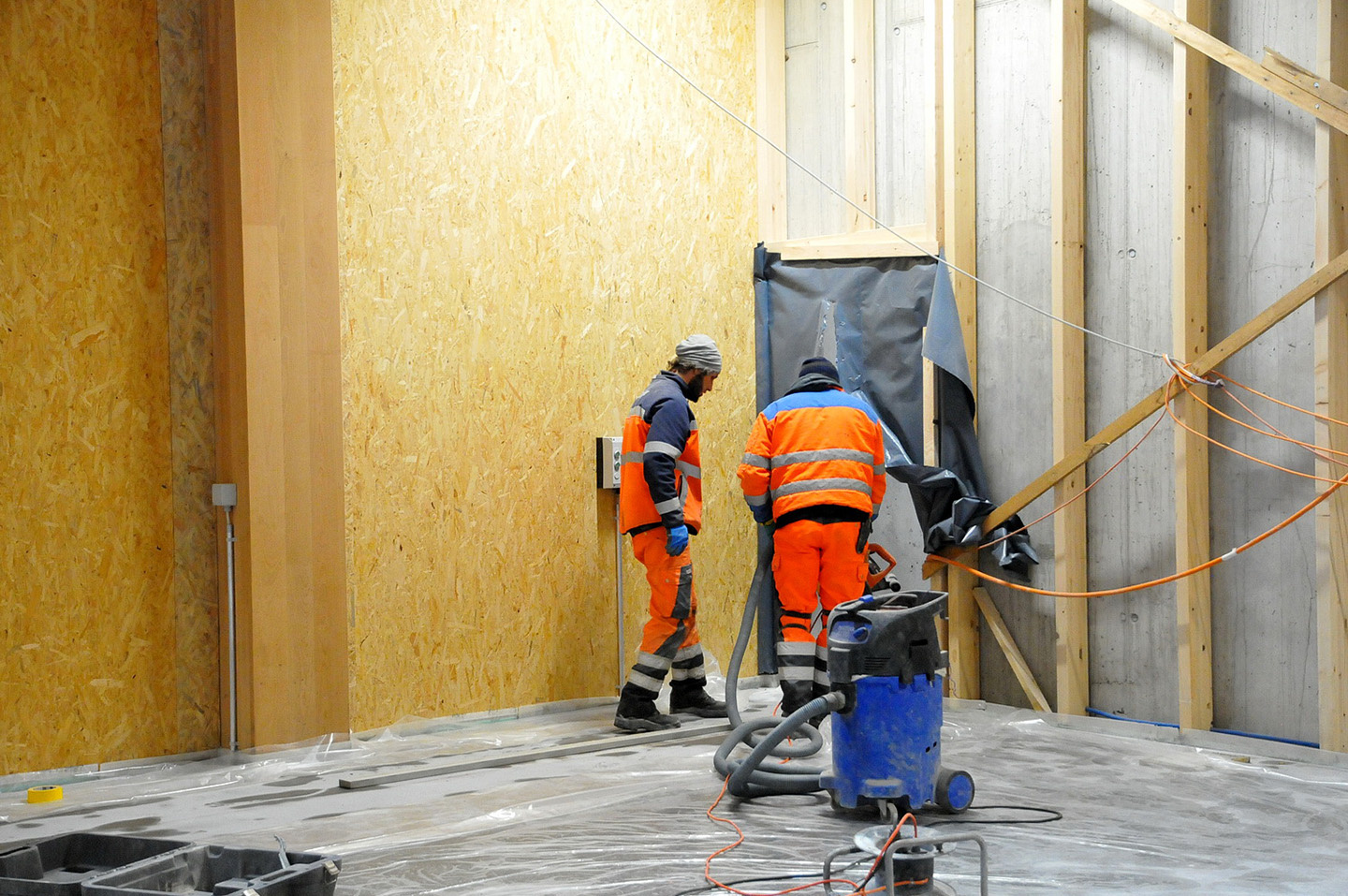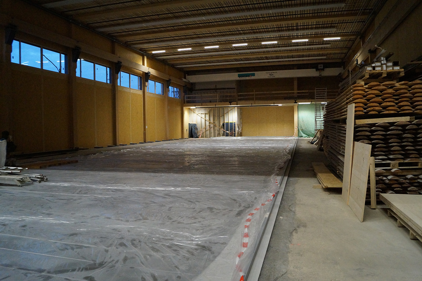 In der Hallenmitte wurde eine 2 cm dicke Schicht aus Hartbeton eingebracht. Diese Betonschicht in der Hallenmitte dient als Ausgleich und wird im Anschluss mit einem Holzboden bedeckt. Wichtig ist dabei eine maximale Toleranz von +/-2mm über die gesamte Schicht, damit später passgenaue Holzelemente auf dem Boden produziert werden können. Der Hartbeton in den seitlichen Fahrgassen ist 10cm dick.