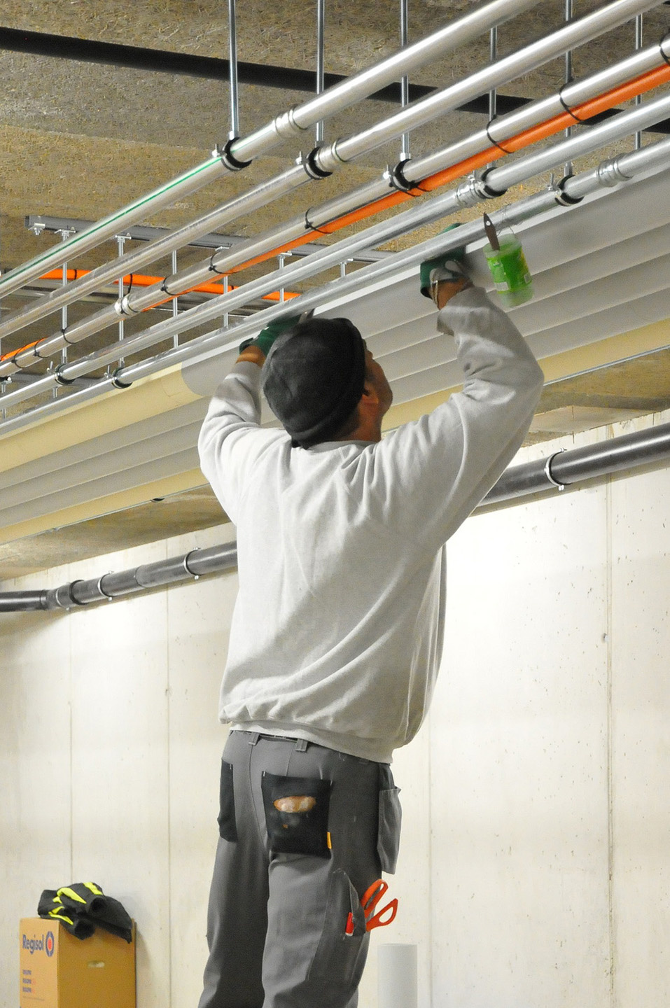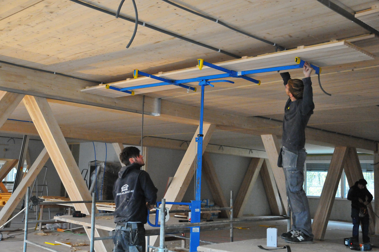 Zudem ist das Substrat für die Dachbegrünung fachmännisch verteilt worden und die im Fachwerk hergestellten Akkustikelemente im Bürogeschoss konnten montiert werden.