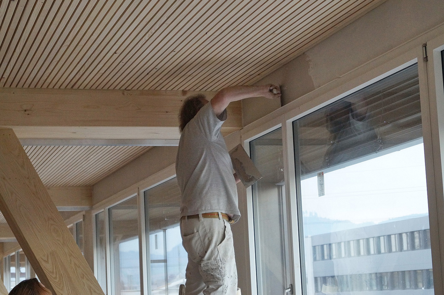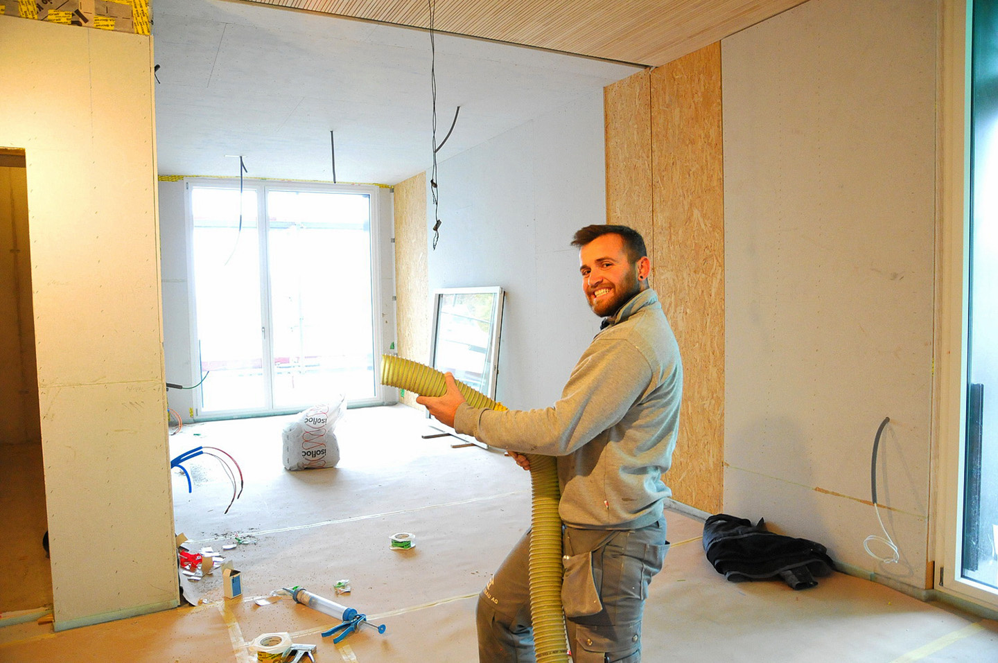 Palettenweise stehen die PV-Panels bereit für eine baldige Montage. Im Innenbereich sind bereits die Gipser am Werk.