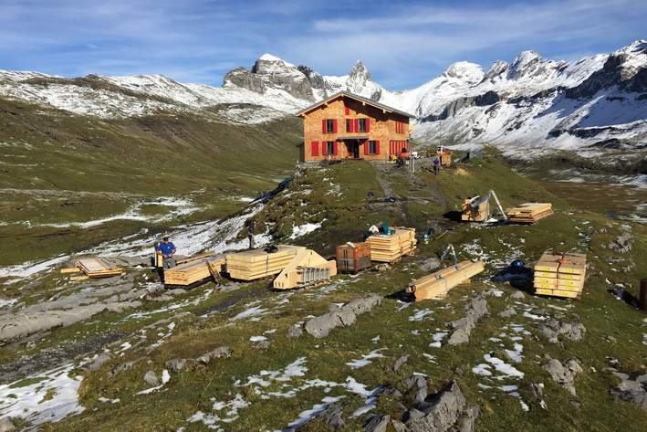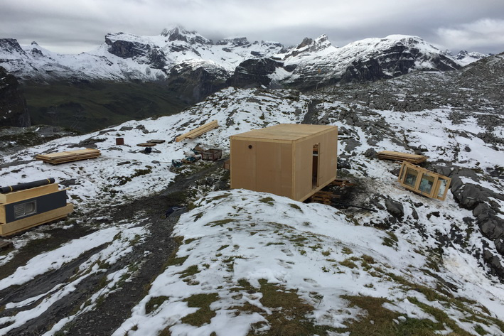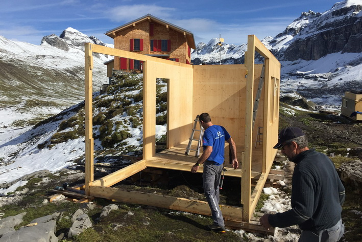 Einen ganzen Sommer lang diente unser Versorgungsmodul auf der Glattalp im Muotathal während der Totalsanierung der SAC Hütte Glattalp als erweiterte Baustelleninstallation. Der Baustellenkoch hatte ein Küche sowie Schlafstellen für 2 Personen, der zusätzlichen Anbau an das Modul gab der ganzen Baustellenmannschaft ein Dach über dem Kopf zum Essen und in den Pausen, und, ein Zusatznutzen, im Dachboden war ein immer zugänglicher Notunterschlupf vorhanden.