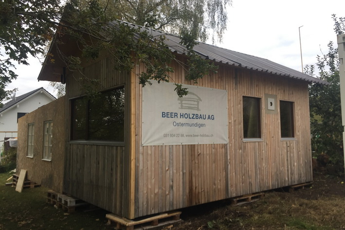Rechtzeitig vor dem Wintereinbruch haben wir das Modul  an einem Tag wieder zerlegt, mit dem Heli ins Tal geflogen und abtransportiert zurück ins Emmental. Schon eine Woche später stand das Kleinsthaus erneut. In Lützelflüh direkt am Bach hatten wir es wieder aufgebaut. Für rund ein Jahr bietet es hier nun das Zuhause für eine Baufamilie. Hier wird wieder gebaut, ein Einfamilienhaus wird weichen und ein Ersatzneubau wird in Zukunft auf der gleichen Parzelle gleich 3 Familien aufnehmen. Die Nähe zur Baustelle ist für den Bauherrn die optimale Situation, schliesslich soll ein grosser Teil der Arbeiten in Eigenleistung realisiert werden.