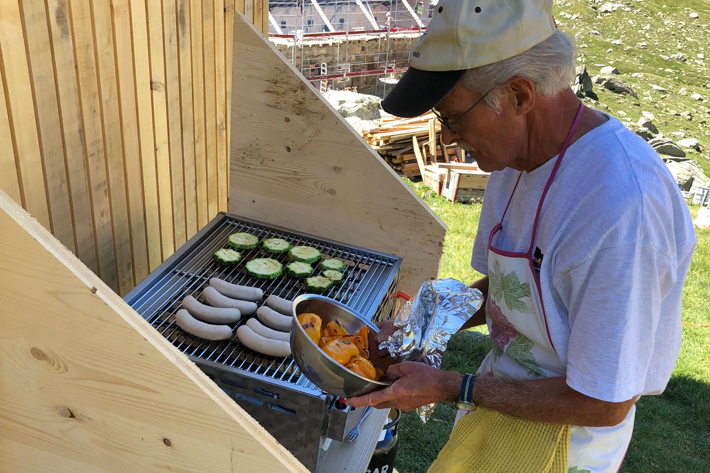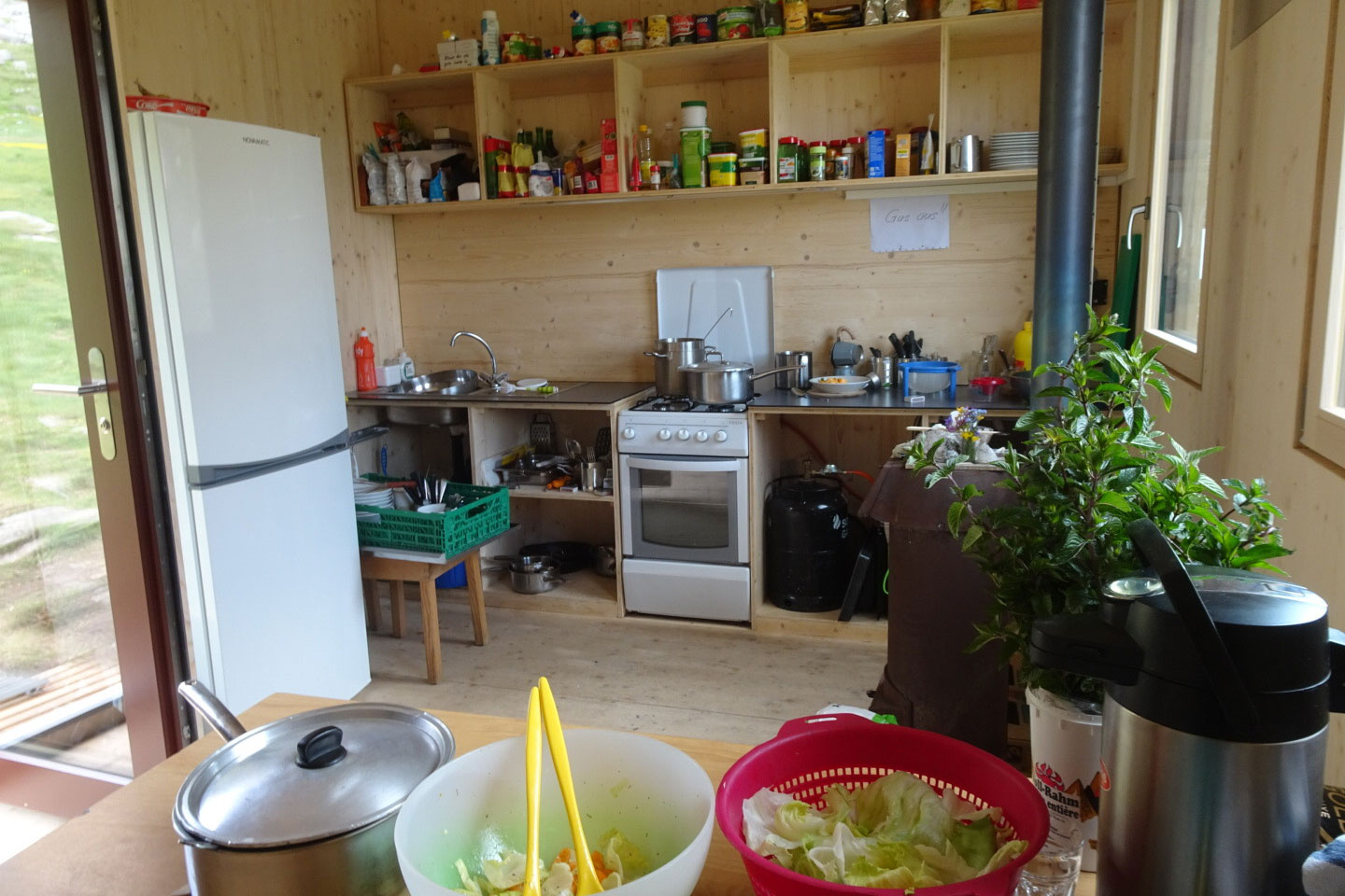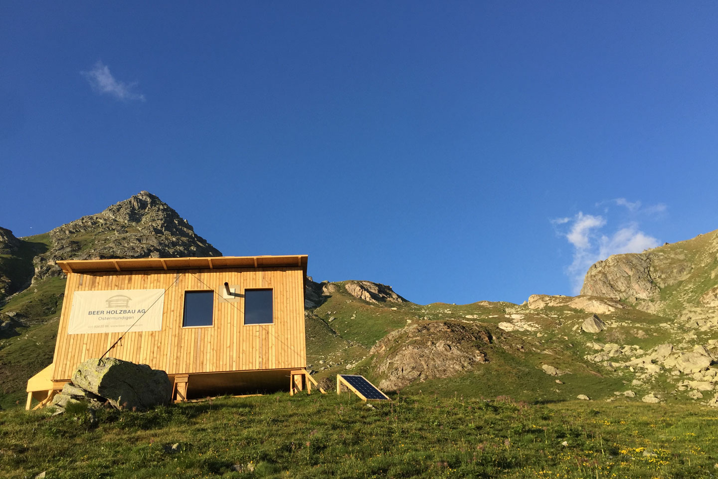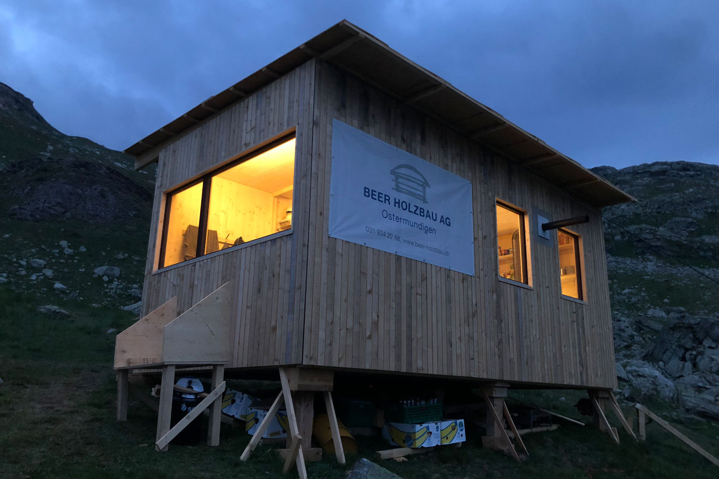 Die Firma Beer Holzbau übernahm während den Sommermonaten die gesamte Baustellenverpflegung, zeitweise wurde für 25 Personen gekocht. Das Versorgungsmodul und das Essen haben einen wesentlichen Teil dazu beigetragen, dass das Arbeitsklima und die Moral der Arbeiter auf kulinarische Weise unterstützt und gepflegt wurden. Das Holz zum Erstellen des Moduls wie auch das Essen wurde per Helikopter zur Hütte geflogen. Alle  65 Mitarbeiter von Beer Holzbau verbindet die Freude an der Arbeit und die Faszination für den Baustoff Holz. Und darum werden wir das Modul für verschiedene Einsätze und Bedürfnisse ausbauen und dementsprechend ausstatten. Es ist koppelbar und kann zu einem kleinen Single Haus erweitert werden.